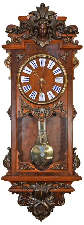 French Large-Scale Burl Walnut and Iron Ormolu Wall Regulator Clock Details