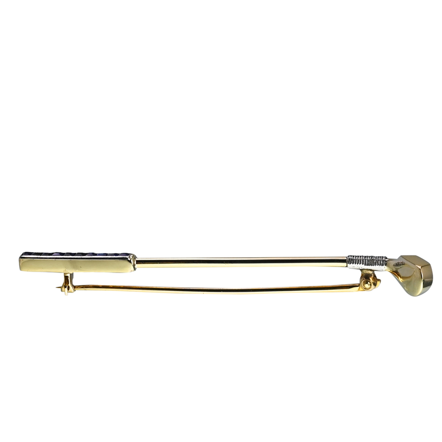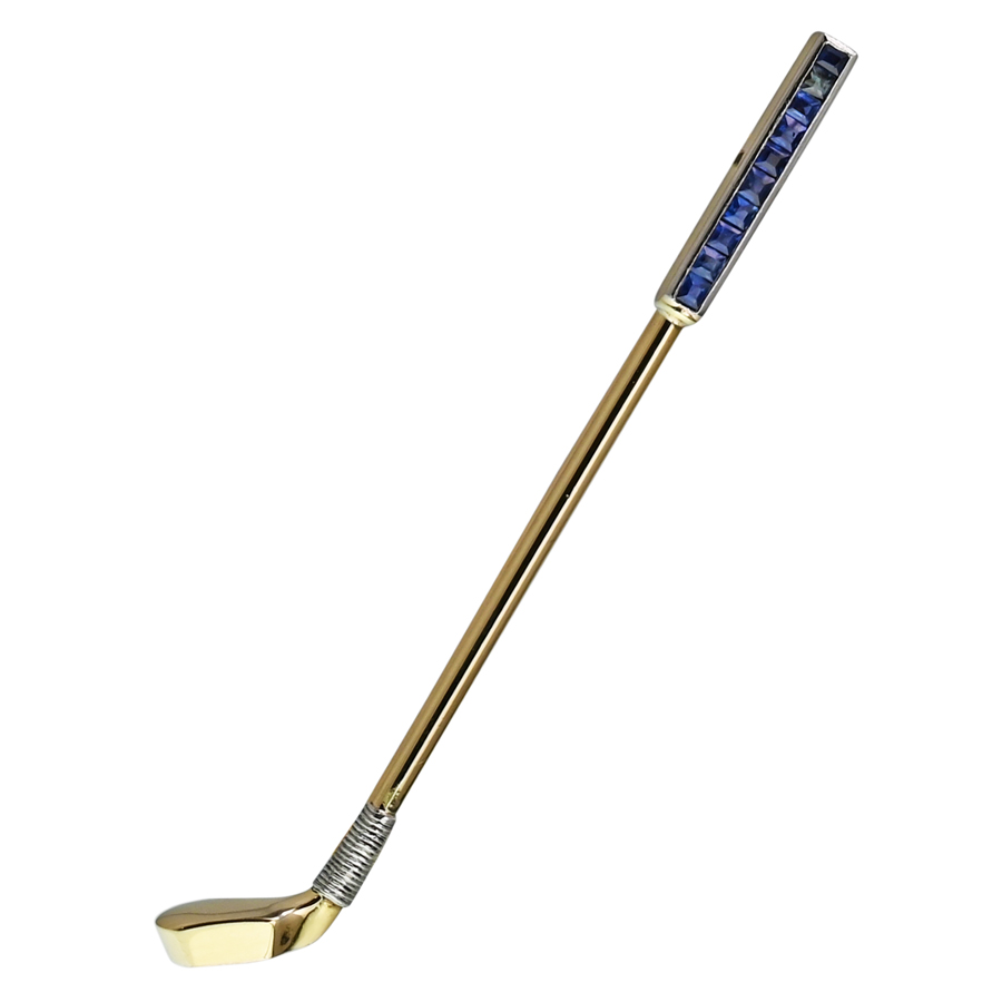 This charming golf club pin is a stylish accent piece on or off the course, and conveys a fondness of the sport. Fashioned in 14K yellow gold accented by 14K white gold as whipping thread on the shaft, and a splash of blue sparkle from sapphires channel set into the handle. The ten blue baguette sapphires have a combined total of 0.28 carats. A winning and versatile jewelry accent piece.