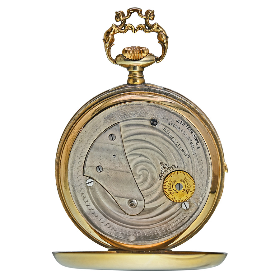 Housed in an open-face gold-filled case with a rare sculptural bow depicting two caryatids supporting the crown, this piece radiates neoclassical grandeur. Beneath its artistry lies a 15-jewel movement, adjusted to four positions, featuring a lever escapement and a bimetallic balance wheel, capable of running for a full eight days on a single wind, an astounding technical feat for its time.
