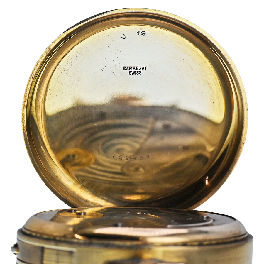 A magnificent fusion of art and mechanics, this rare Swiss 8-day repeating automaton pocket watch is a captivating example of early 20th-century horological artistry. Crafted by Barbezat, this timepiece combines sculptural beauty with complex engineering in equal measure.