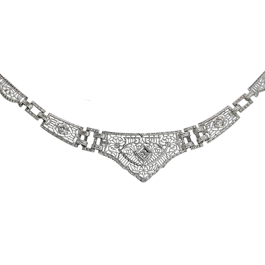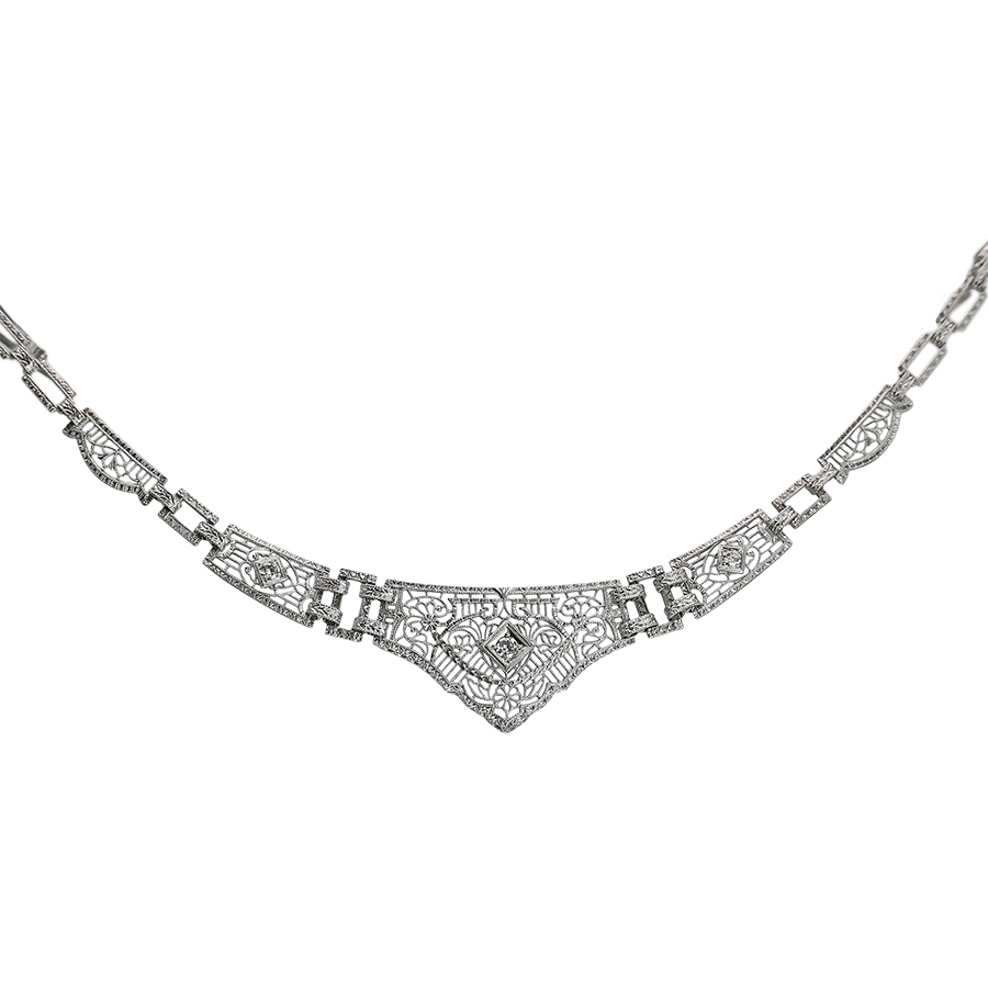 At the center rests a sparkling Old European-cut diamond, framed by two companion diamonds of the same period-cut style, adding a refined brilliance that enhances the necklace’s airy, architectural design. The filigree panels graduate gracefully toward the center, leading to a striking chevron-shaped plaque, while the articulated open-link chain continues the motif in perfect harmony.