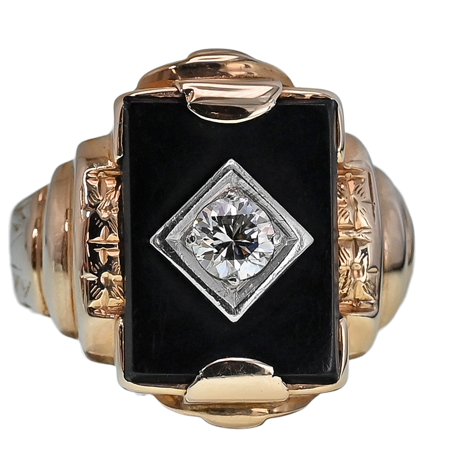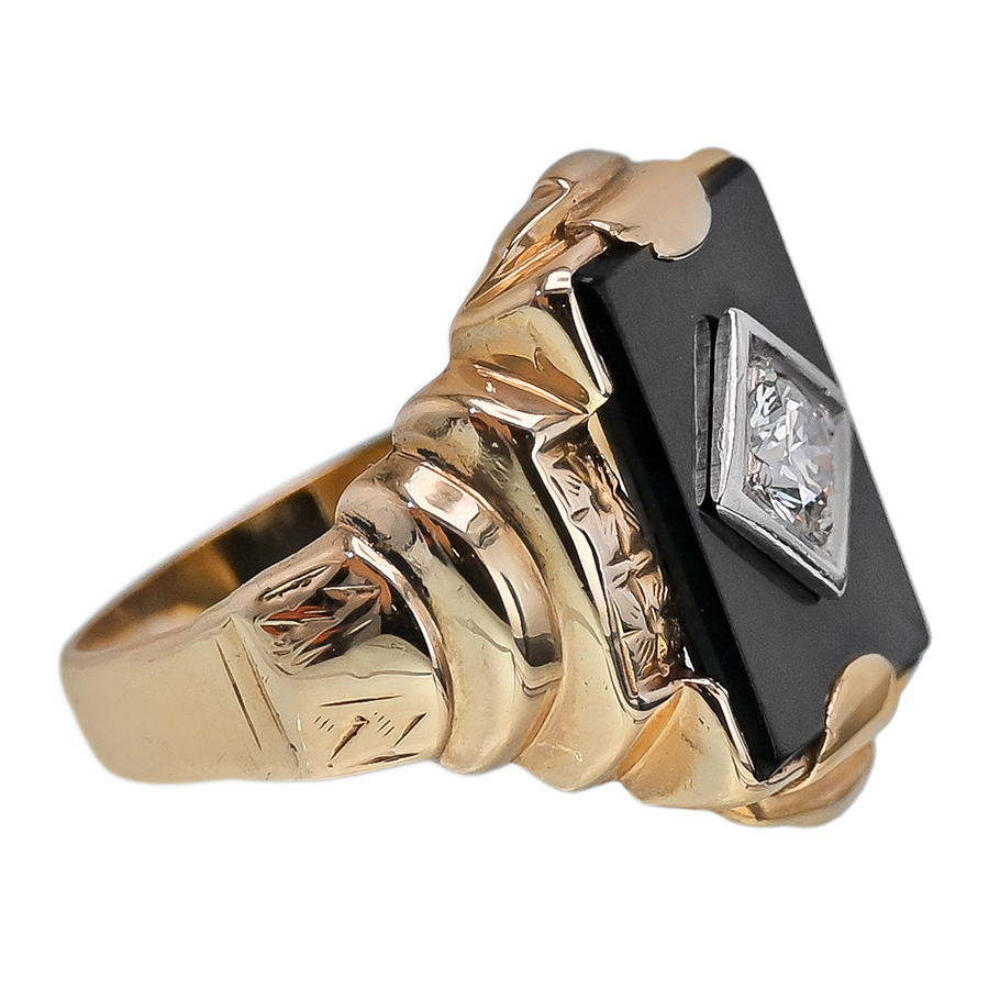 An eye-catching ring that exudes the timeless sophistication and style of black onyx jewelry. Sparkling at the center is a 0.40-carat diamond framed by white gold and set within a rectangular black onyx. The substantial ring setting is crafted of 10K yellow gold and artistically styled with accent engravings flanking the black onyx and stepped, engraved shoulders. Further, this ring bears the signature of George O. Street, a jewelry company known for producing high-quality gold jewelry and supplying retailers such as Tiffany prior to World War II.