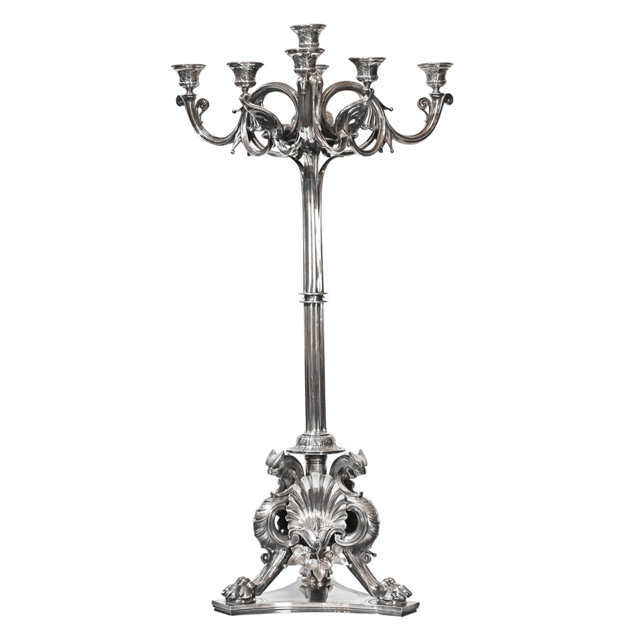 This exceptionally large candelabra exudes the lavish and ornate decorative style of many a Victorian home. It was expertly crafted by Elkington, Mason & Co. of Birmingham, England. Known for their large and elaborate metalworks, Elkington, Mason & Co. received many royal commissions and were regarded as the English pioneers of silver electroplating. This wonderful example bears their masterful electroplated silver finish.