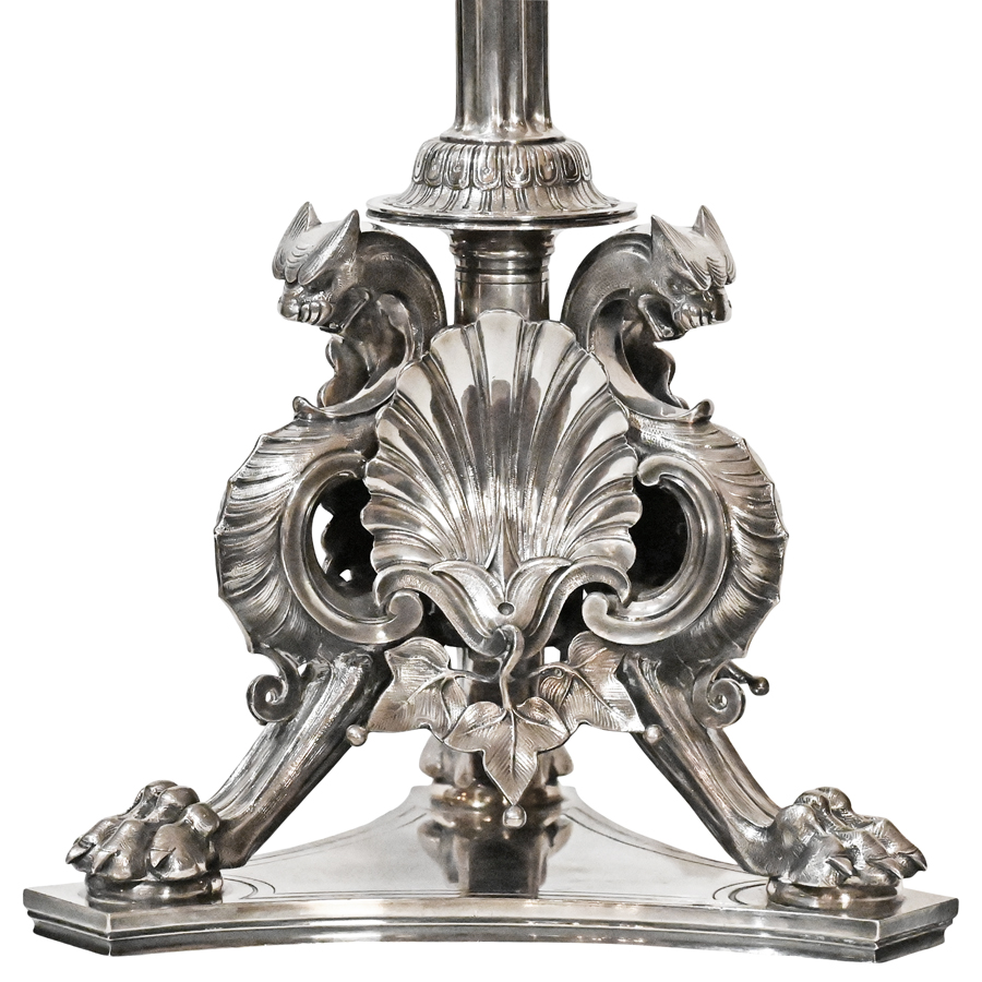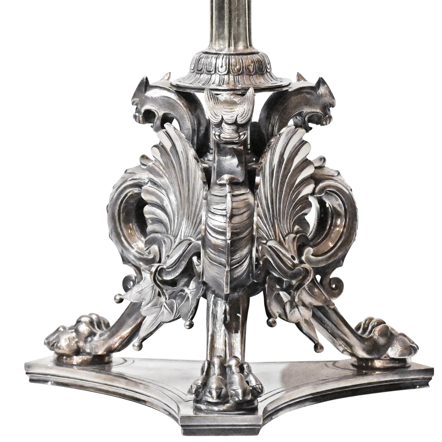 Fulfilling the Victorian decorative aesthetic for dramatic and opulent style, the candelabra stands just over 29 inches in height and depicts an artful mix of natural and fantastical elements. Scrolling arms of organic foliate form with leaf and small sphere embellishments support the seven foliate engraved candle cups. The center column is deeply reeded and leads to the tripod base comprised of dragons, fan shells and ivy leaves, and is raised on claw feet supported on a flat three-sided base.