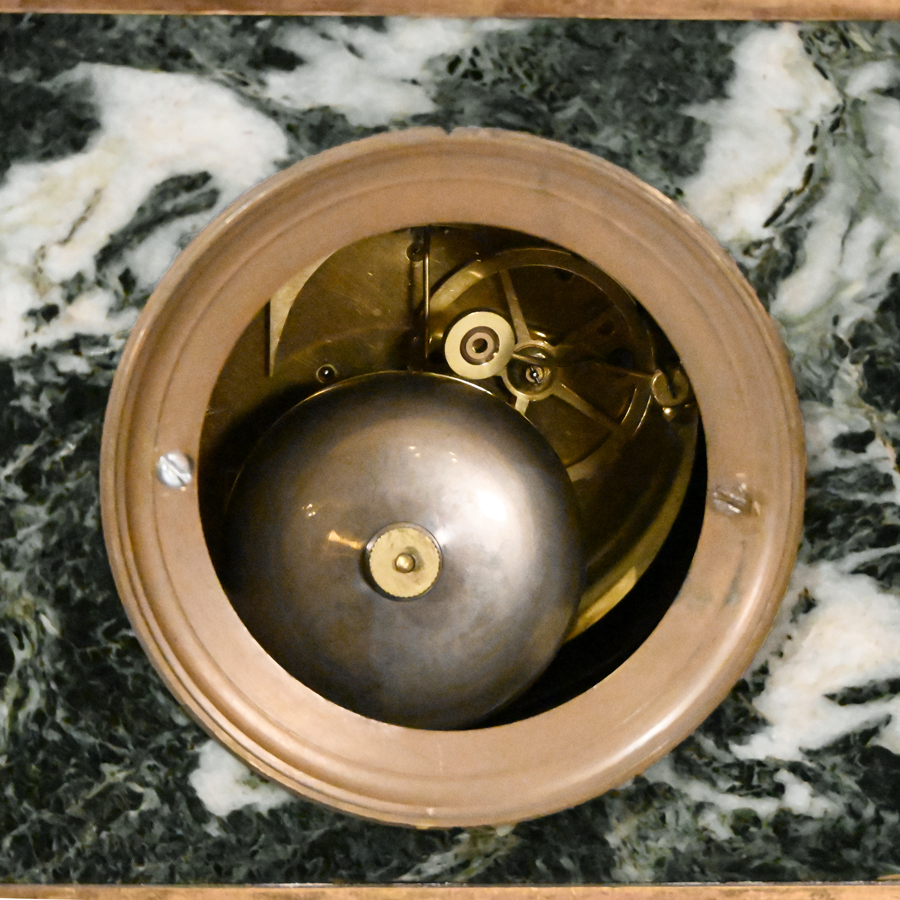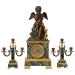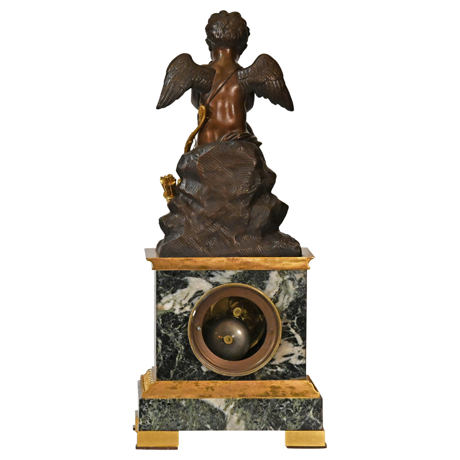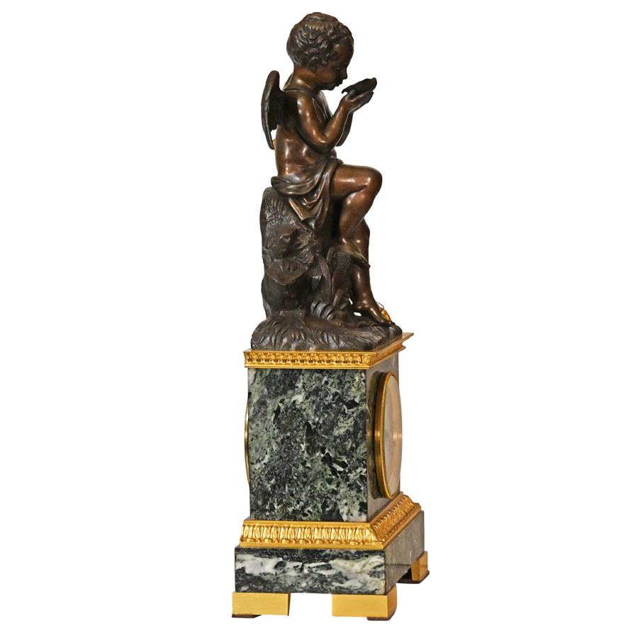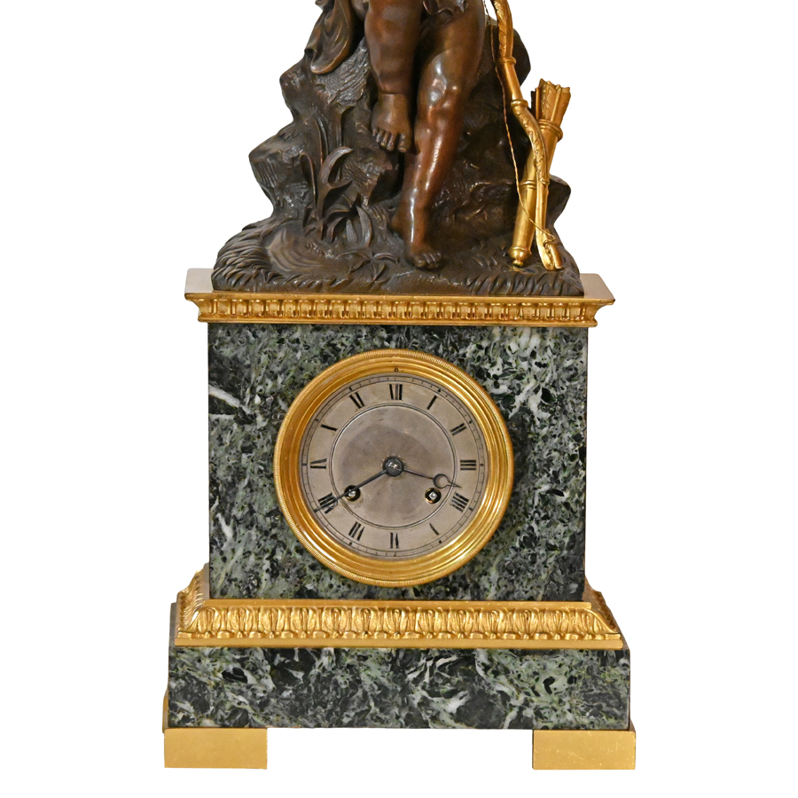 This French clock garniture is a wonderful combination of timekeeping, decorative accent, and sculpture. The clock resides in a case of Italian verde marble ornamented with gilt ormolu mouldings and raised on a plinth base supported on gilt feet. Flanking the clock are three-light candelabra of conforming shape and veined marble fashioned with two bronze scrolling arms, candle cups accented by gilt bobeche, and gilt finials at the center. The clock is surmounted by a bronze sculpture of a sweet little cherub depicted resting on a bank. His gilt finished bow and quiver are set aside while he takes refreshment from a shell.