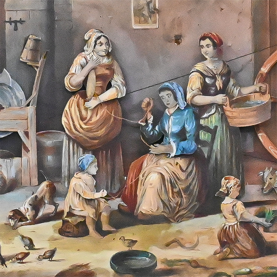 Suspended on the back wall of the scene is the timepiece itself, integrated naturally into the painted interior and framed as part of the household environment. When activated, the mechanism plays music and animates. The figures in a harmonious sequence, transforming the painted surface into a living vignette. The painting is housed in its original carved wooden frame, emphasizing the rustic, architectural character of the scene.