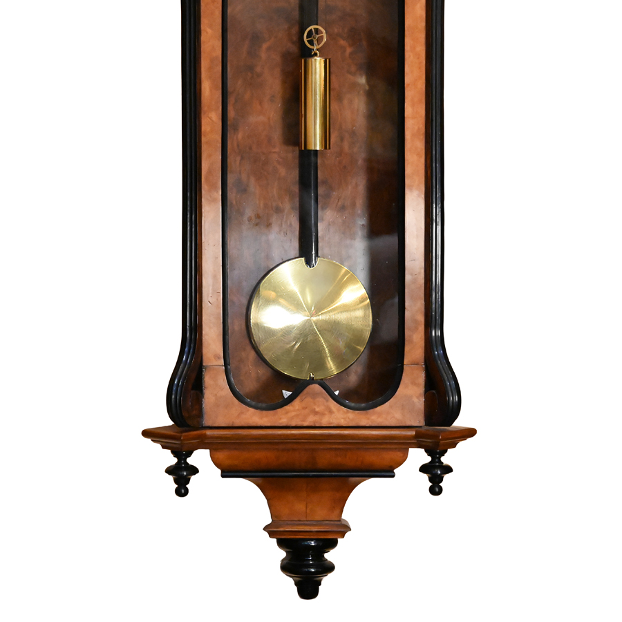 This beautiful Vienna regulator was produced in the early 1880s by Lenzkirch, a name synonymous with expert craftsmanship and timekeeping. Masterfully crafted in a case with burled walnut accented by ebonized trims and architectural in form. Featuring a curved pediment with decorative keystone embellished with finials above the sleek case with a shaped glass door panel over an inverted plinth base and drop pediment with conforming finials.