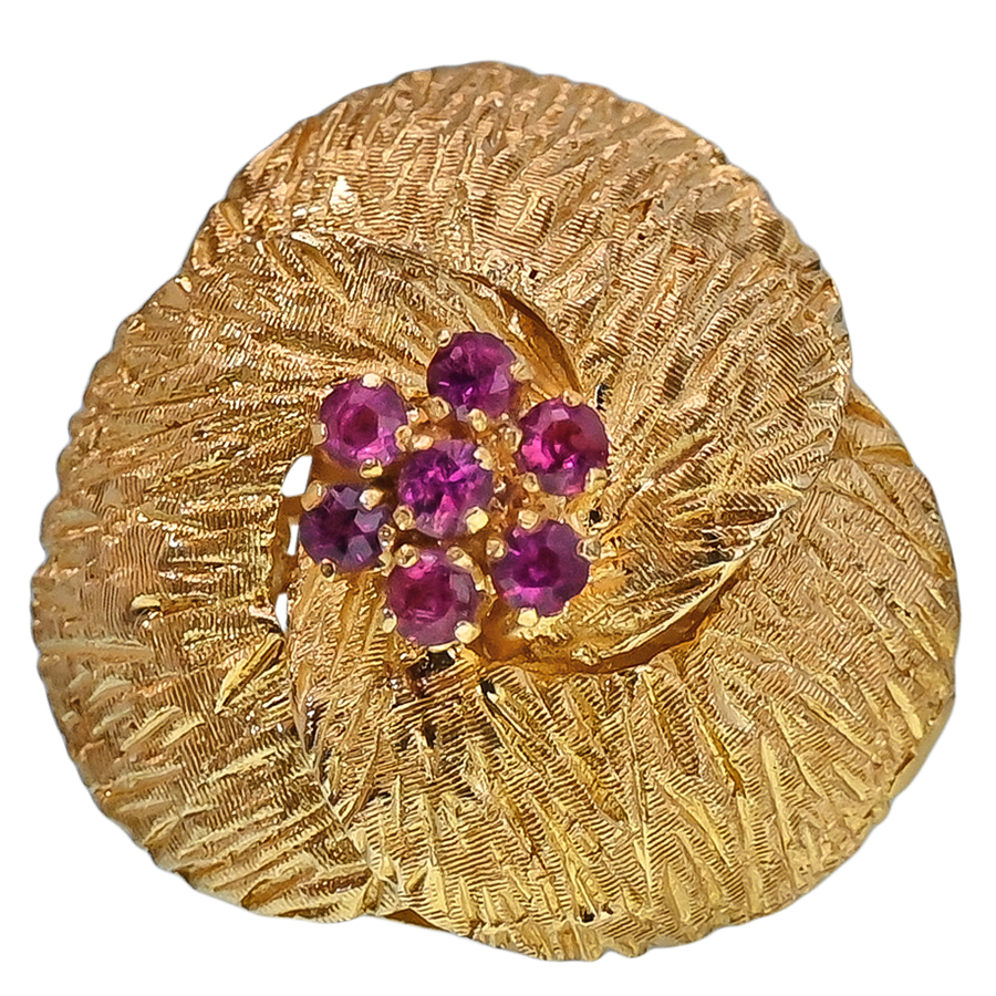 Alluring and stylish, this 18K yellow ring takes the sculptural form of a flower with a cluster of rubies at its center. Skillfully crafted in Italy in the form of three separate swirls that emulate flower petals and are artistically embellished throughout with detailed cross-hatching. Glowing at the center, the flower is composed of 7 round rubies totaling 0.28 carats. The thoughtful styling of the ring portrays a lovely, artful mix of fluidity and precision. Currently a size 6.75, this beautiful ring can be resized.