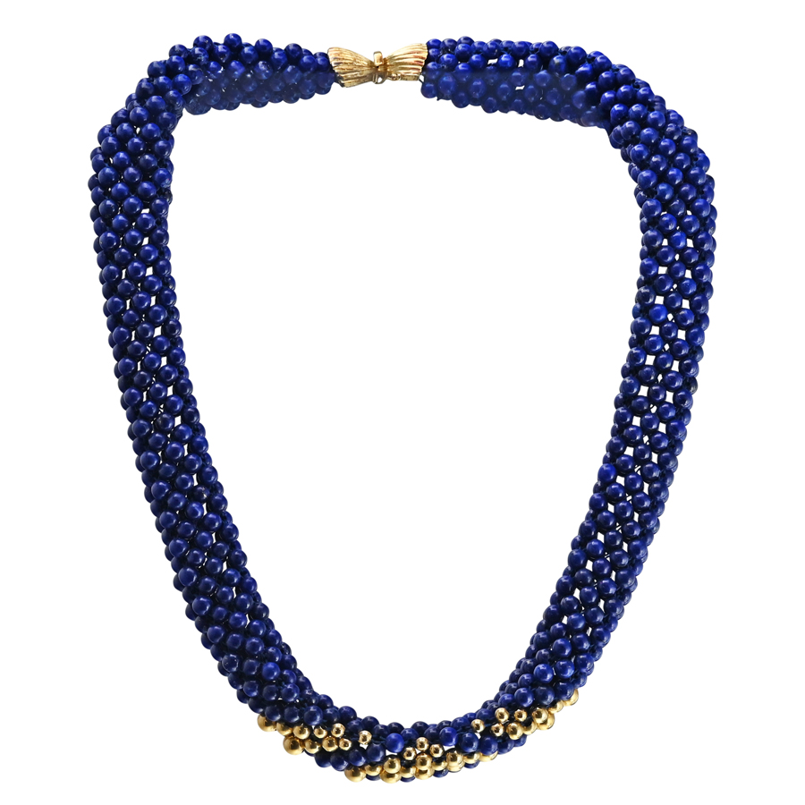 This lovely necklace is comprised of dye enhanced lapis lazuli beads woven together and accented by a portion interspersed with 14K yellow gold beads. A beautiful 14K yellow gold decorative fluted clasp stylishly secures the necklace.  Wonderfully versatile for how it can be worn and paired with various ensembles.