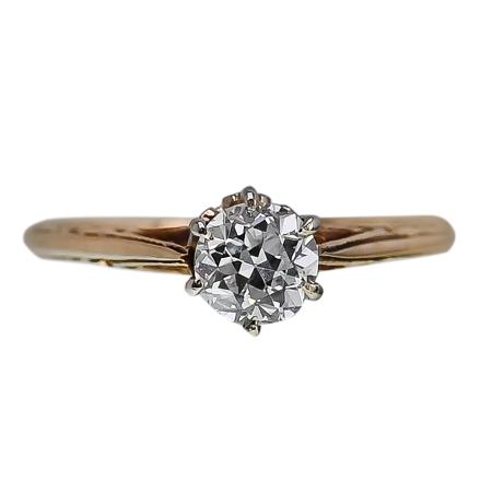 This wonderful and elegantly styled diamond solitaire ring dates to the turn of the century. Showcasing a 0.62 carat Old European Cut diamond emitting its special sparkle. The beautiful gem is secured with six prongs and raised in a cathedral gallery that accommodates light and a full view of the precious antique gem. Delicate artistic details and engravings embellish the ring, crafted in 14K yellow and white gold. The diamond possesses an SI2 clarity and G color rating.