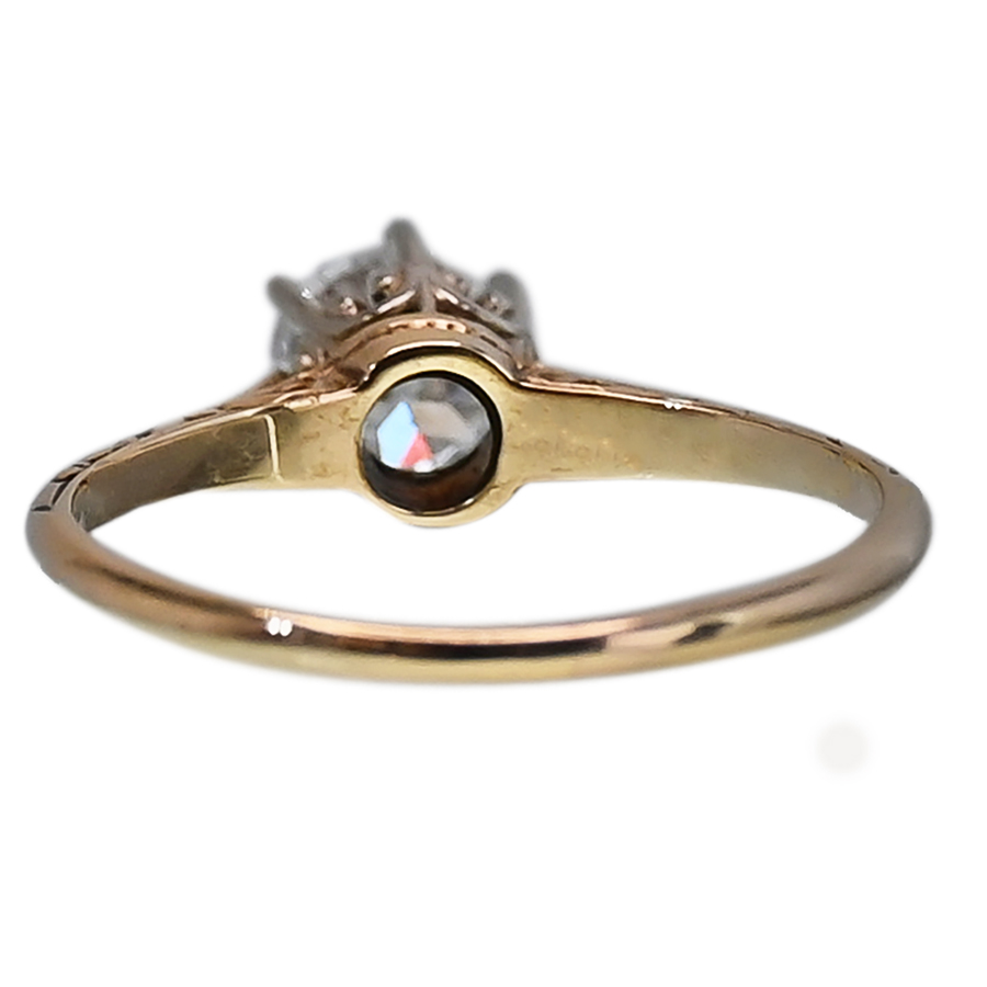 This wonderful and elegantly styled diamond solitaire ring dates to the turn of the century. Showcasing a 0.62 carat Old European Cut diamond emitting its special sparkle. The beautiful gem is secured with six prongs and raised in a cathedral gallery that accommodates light and a full view of the precious antique gem. Delicate artistic details and engravings embellish the ring, crafted in 14K yellow and white gold. The diamond possesses an SI2 clarity and G color rating.