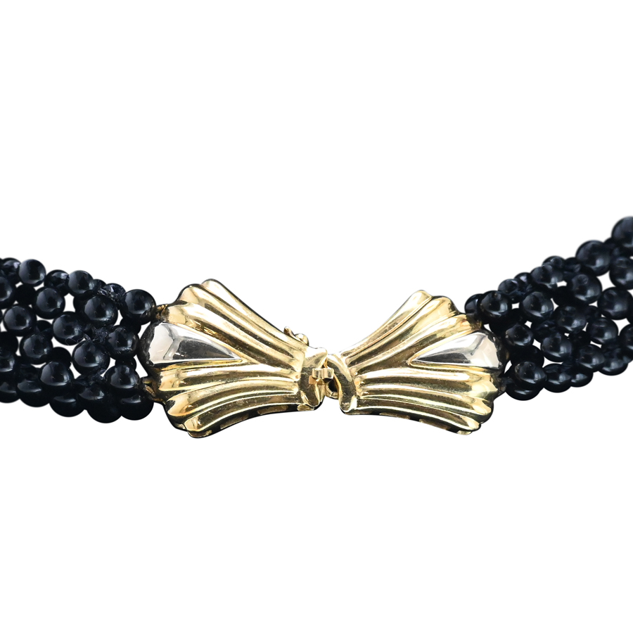 This chic necklace is comprised of dye enhanced onyx beads woven together. A stylish 14K yellow gold clasp accents the rich black beads and adds a fashionable touch as it can be worn in various placements around the neck. A wonderfully versatile jewelry piece that can be dressed up or down, and is suited to a broad range of styles.