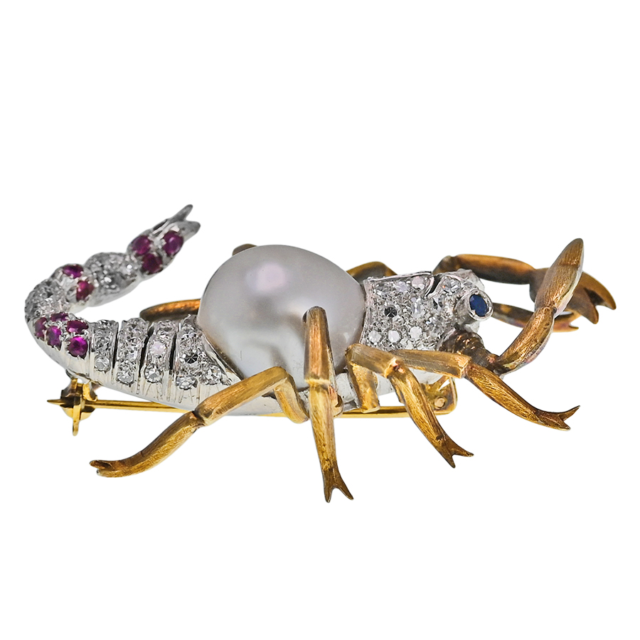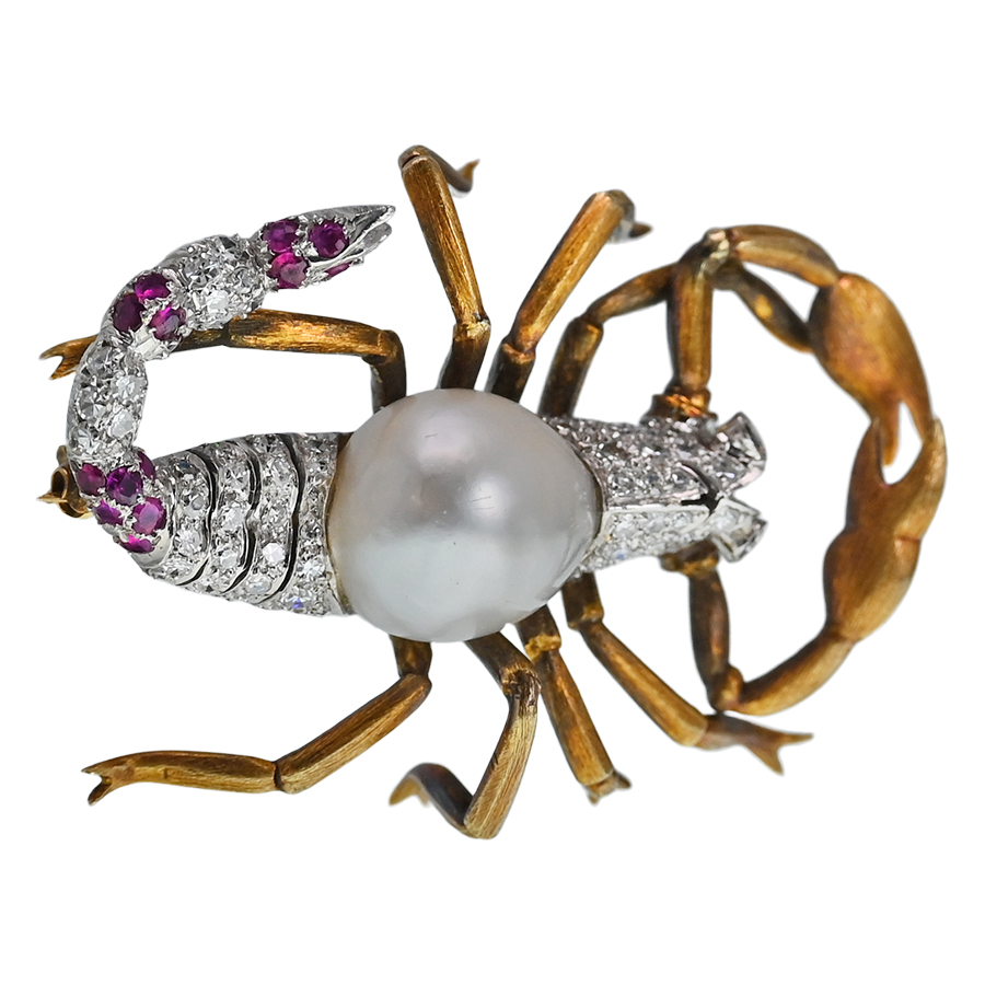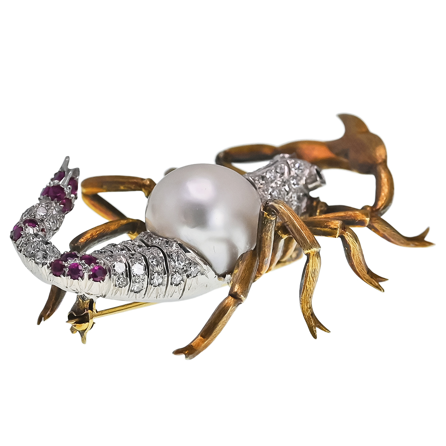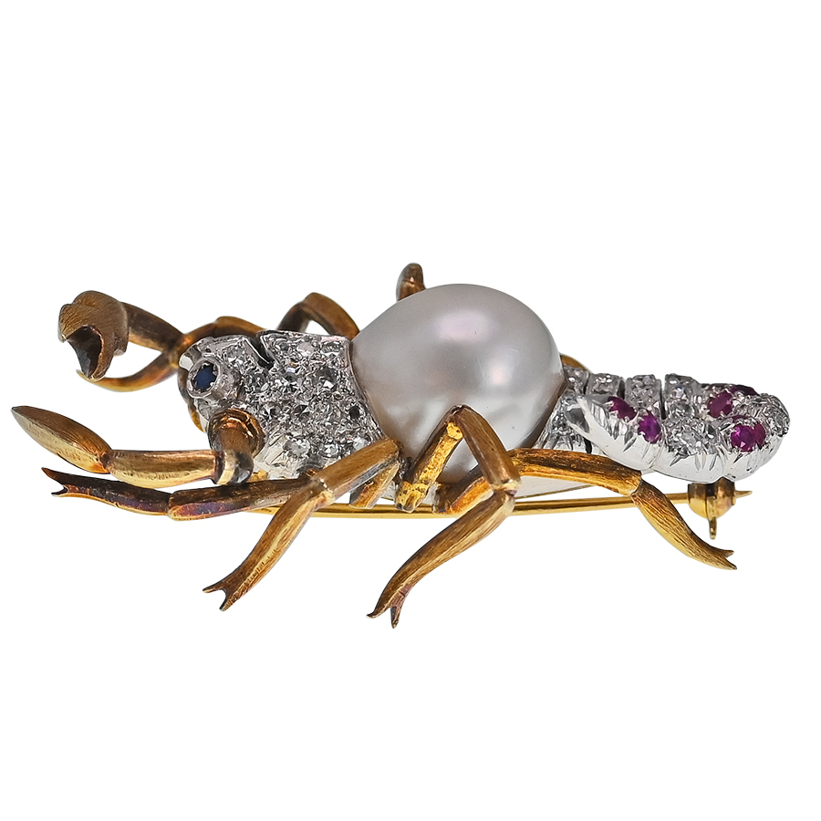 Pearl, Diamond, and Ruby Scorpion Brooch