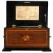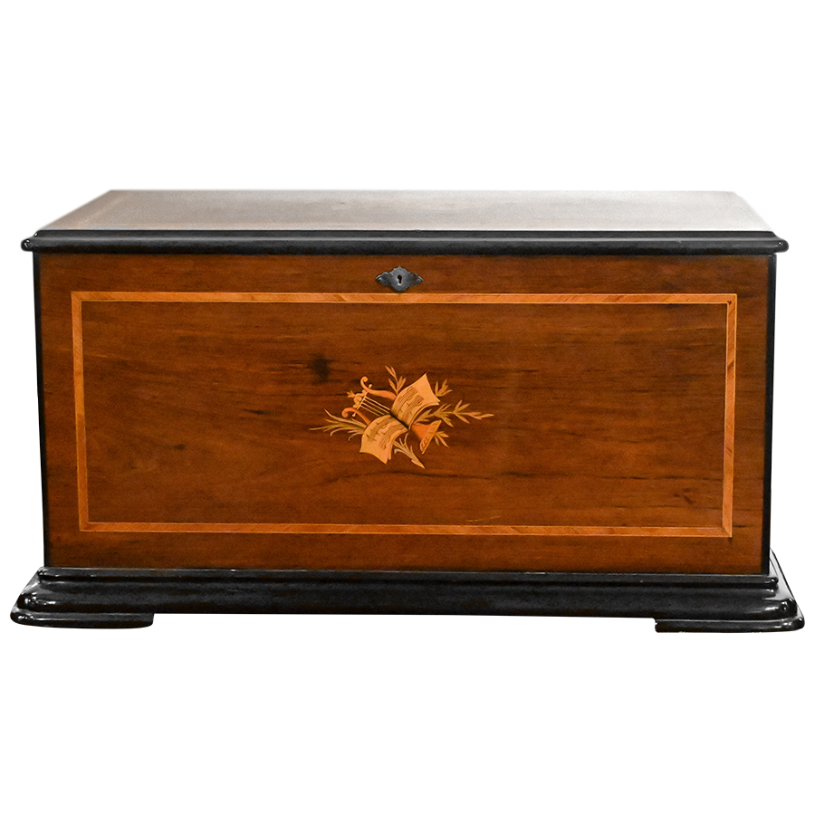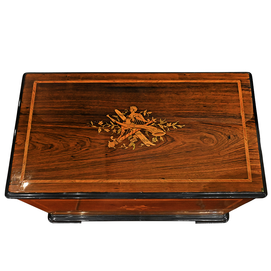 Inside, a 13-inch cylinder movement performs eight distinct melodies, accompanied by a mechanical orchestra of instruments. A reed organ, five tuned bells with charming bumblebee strikers, a snare drum, and castanets each add texture and rhythm to the performance. The ensemble produces a layered musical effect that is deep, resonant, and remarkably lifelike for its era. The case is crafted of rich Brazilian rosewood, exhibiting a beautiful natural grain, bordered by contrasting crossbanding. Fine marquetry inlays adorn the case, depicting a harp, horn, and scrolls bound with laurel leaves, symbolizing harmony and the art of music.