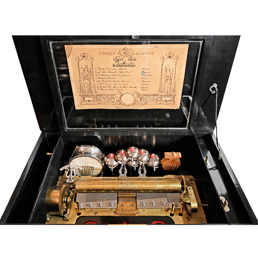 The interior lid retains its original hand-engraved tune card, a rare survival that lists each composition played by the box, adding to its originality and visual appeal. A striking fusion of Swiss precision, decorative artistry, and musical engineering, this piece captures the grandeur of the late 19th century’s fascination with mechanical music.