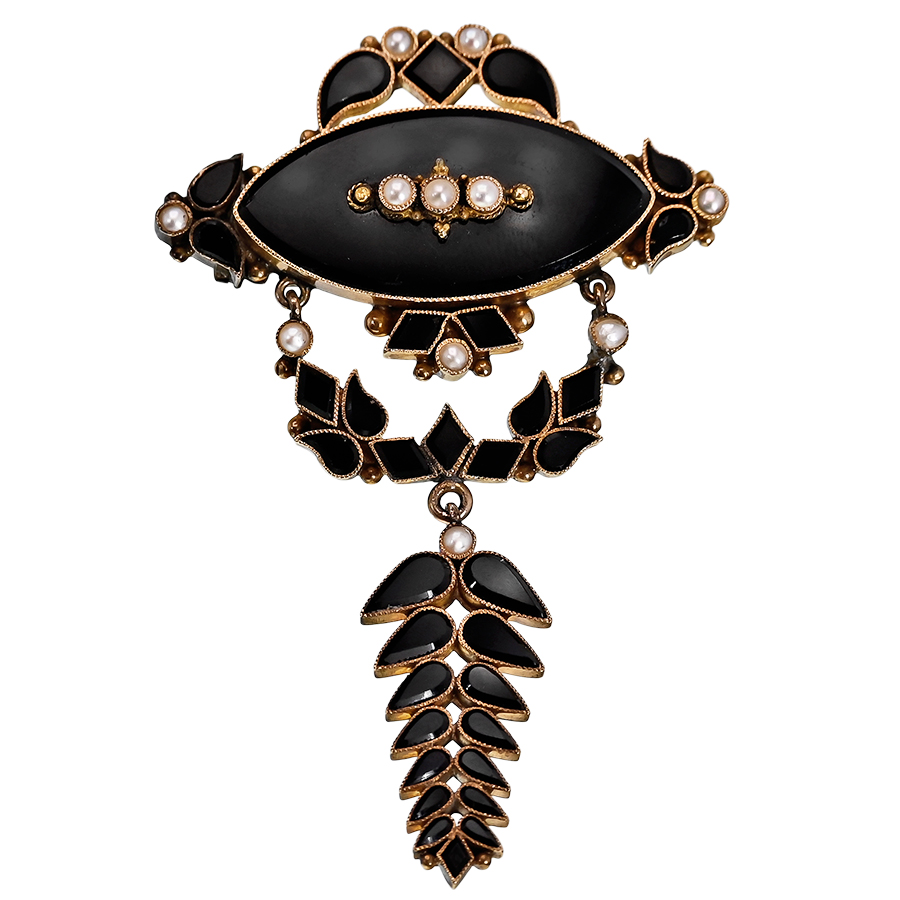 This brooch is another dramatic display of Victorian jewelry, a testament to the skill and artistry of Victorian craftsmanship. Likely a mourning brooch stemming from the substantial cultural and fashion influence of Queen Victoria, this piece dates to the 40 years of mourning for her beloved Albert. Striking jewelry pieces such as this, however, quickly extended beyond mourning protocol into jewelry fashion.