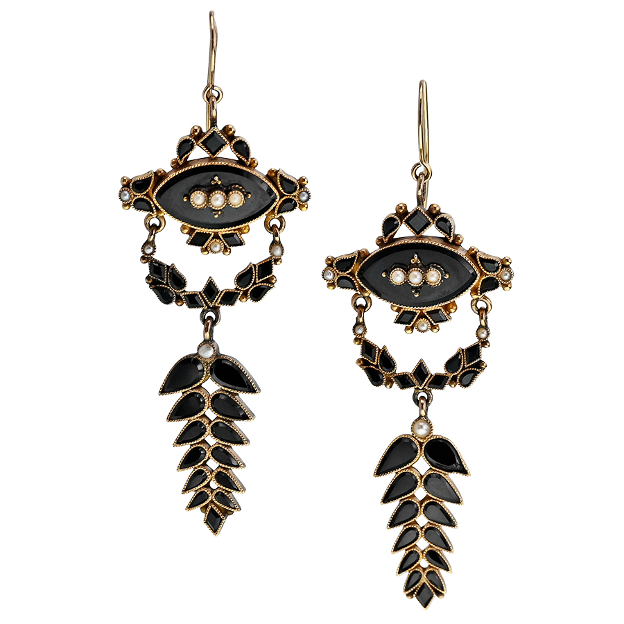 These dramatic earrings showcase the adept and artistic craftsmanship of the late 19th century. Taking a cue from Queen Victoria and her tremendous influence on fashion and jewelry, they were quite possibly mourning earrings and are crafted with a substantial amount of black onyx. The onyx is cut into several shapes and set in 15K yellow gold, with millgraining framing each piece. A tiered structure beginning with a large central marquis piece is inset with 3 seed pearls and is surrounded by arrangements of teardrop and diamond-shaped onyx pieces punctuated by seed pearls and gold beads. Beneath that, a free-swinging swag of the onyx pieces continues to a dramatic drop of graduated teardrop-shaped onyx pieces finishing in a diamond-shaped piece.
