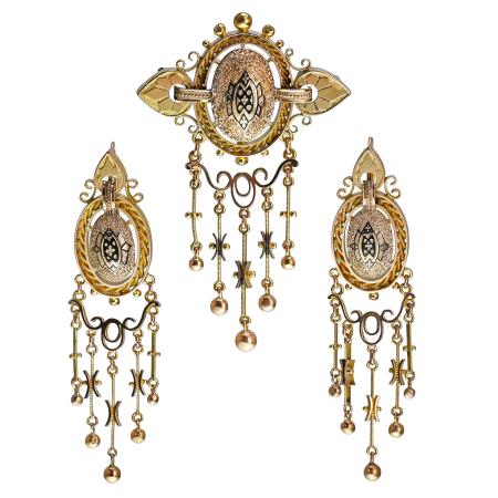 This beautiful Victorian demi parure, or partial jewelry suite, dates to the mid 1800s and comprises a brooch and earrings. Luxuriously and intricately crafted with an abundance of warm 14K yellow gold and a variety of embellishments and trims. Such an opulent display of gold and artistry not only accessorized one’s elaborate Victorian attire, but also spoke of status.