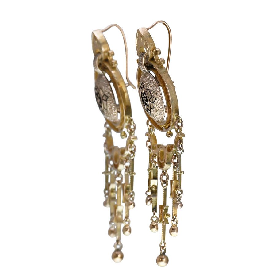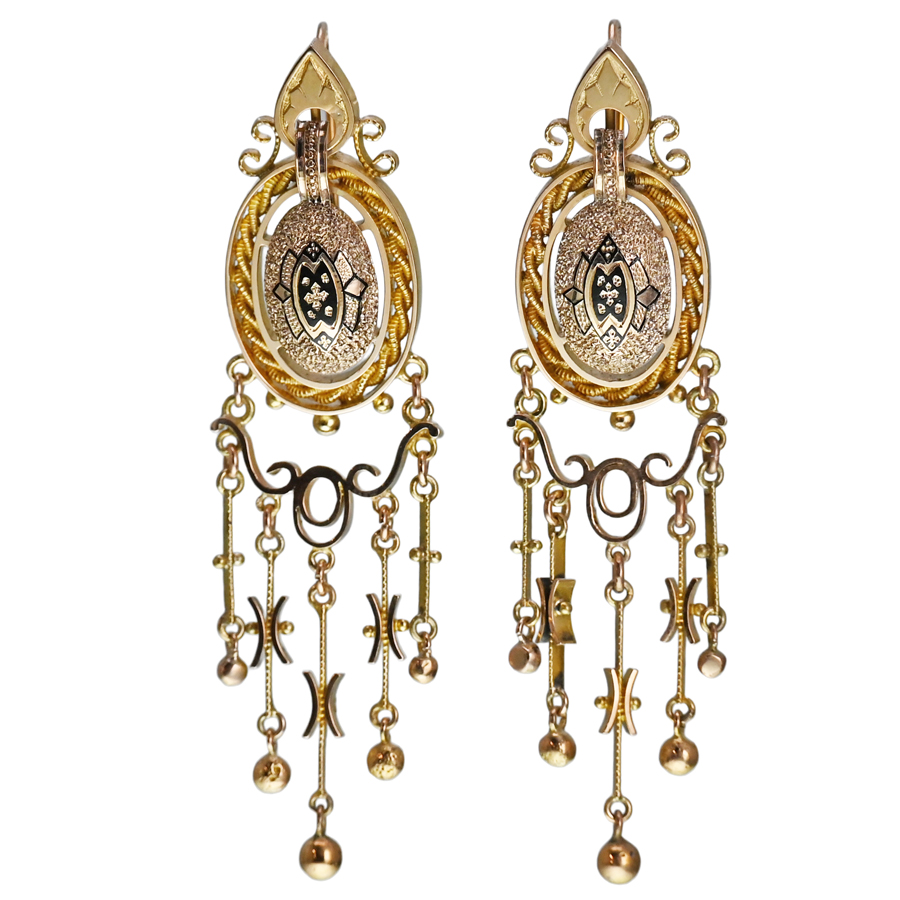 The pieces feature decorative oval centers of low relief black enamelling and taille d’epargne. Taille d’epargne refers to a form of champlevé decoration in which engraved lines of a metal base are filled in with enamel. Rope twists encased in oval surrounds frame and accent the centers. Milgraining, engraving, and scroll forms add further embellishment, while dangles of freely swinging embellished gold rods with ball drops add a dramatic flourish.