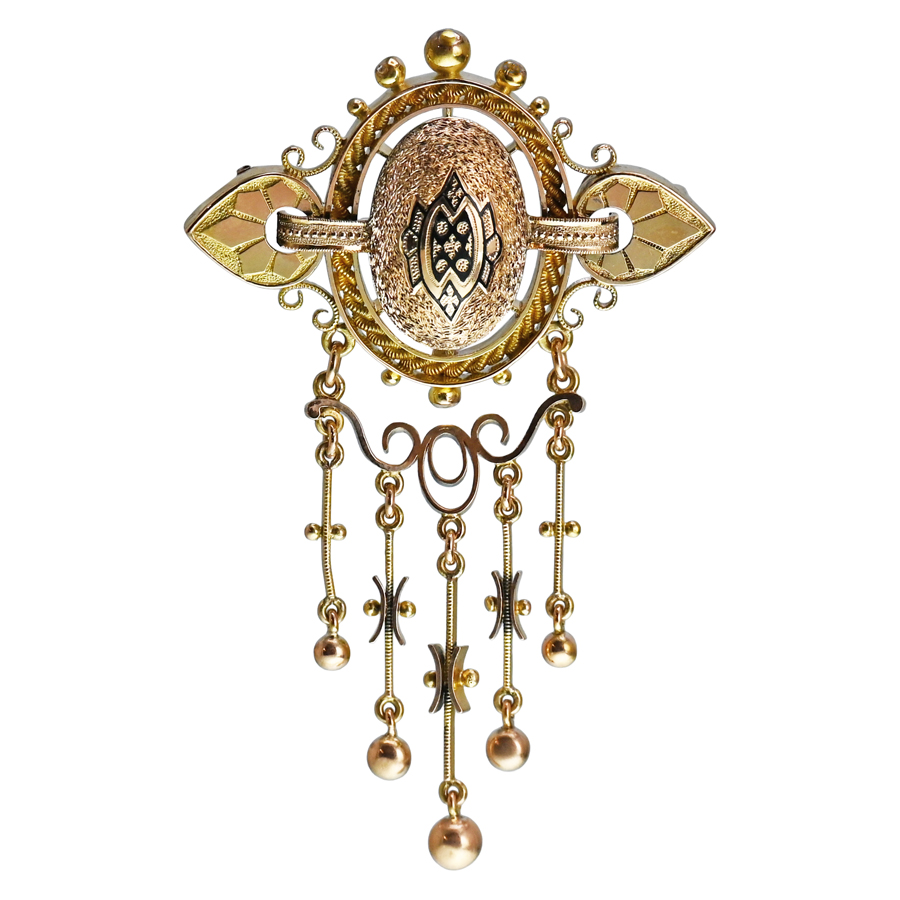 This beautiful Victorian demi parure, or partial jewelry suite, dates to the mid 1800s and comprises a brooch and earrings. Luxuriously and intricately crafted with an abundance of warm 14K yellow gold and a variety of embellishments and trims. Such an opulent display of gold and artistry not only accessorized one’s elaborate Victorian attire, but also spoke of status.