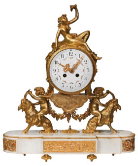 French Gilt Bronze Bacchic Parade Figural Mantel Clock Details