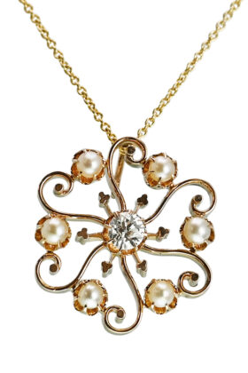 14K Yellow Gold Diamond and Pearl Pendant Details