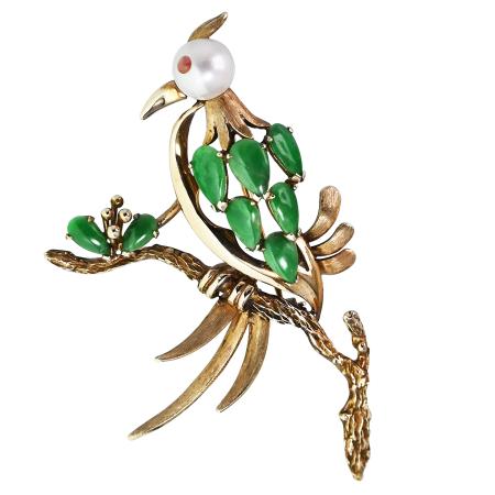 This delightful bird brooch no doubt took inspiration from the avian fauna of the natural world. Crafted in smooth and textured 14K yellow gold, this exotic bird on a branch is embellished with 6 pear-shaped jadeites and another 2 slightly smaller jadeites serve as petals on a nearby blossom. The 8 jadeites total 3.99 carats and are prong set. A cultured 6.88mm pearl is used for the head and accented by a bit of sparkle from a small orange sapphire eye.