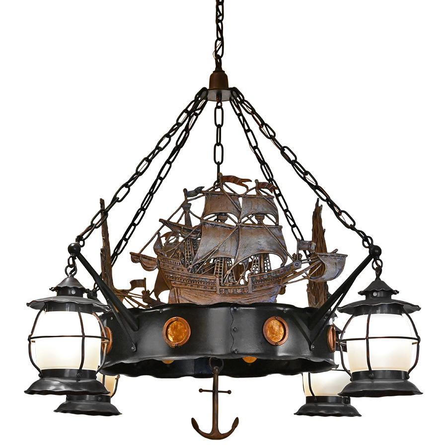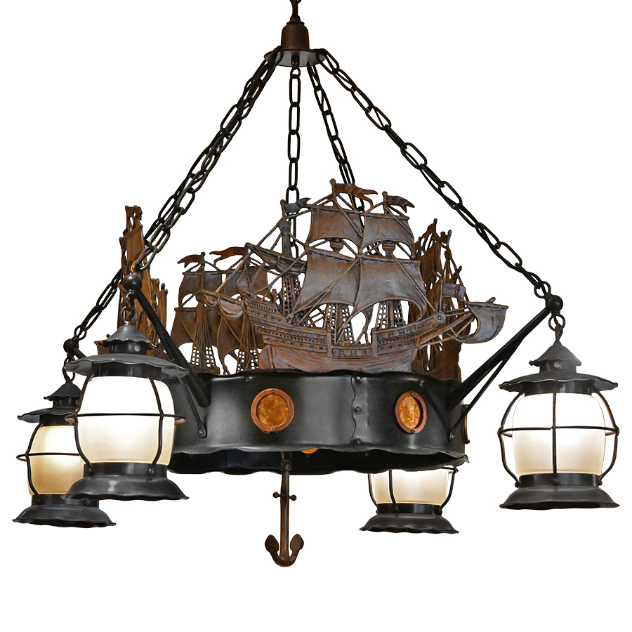 This custom chandelier formerly illuminated a seafood restaurant on San Francisco’s famous Fisherman’s Wharf. Artfully hand-crafted with iron, aluminum, and brass. Its nautical theme showcases well-detailed Spanish galleons done in relief with polychrome finish and affixed to a central band appointed with mica-inset portholes. Light comes from four ship’s style lanterns. A single chain at the top descends to a canopy that joins four chains extending to the lanterns, and an anchor adds the finishing touch as a drop finial. This unique nautical chandelier exudes a wonderful rustic and artistic warmth.