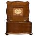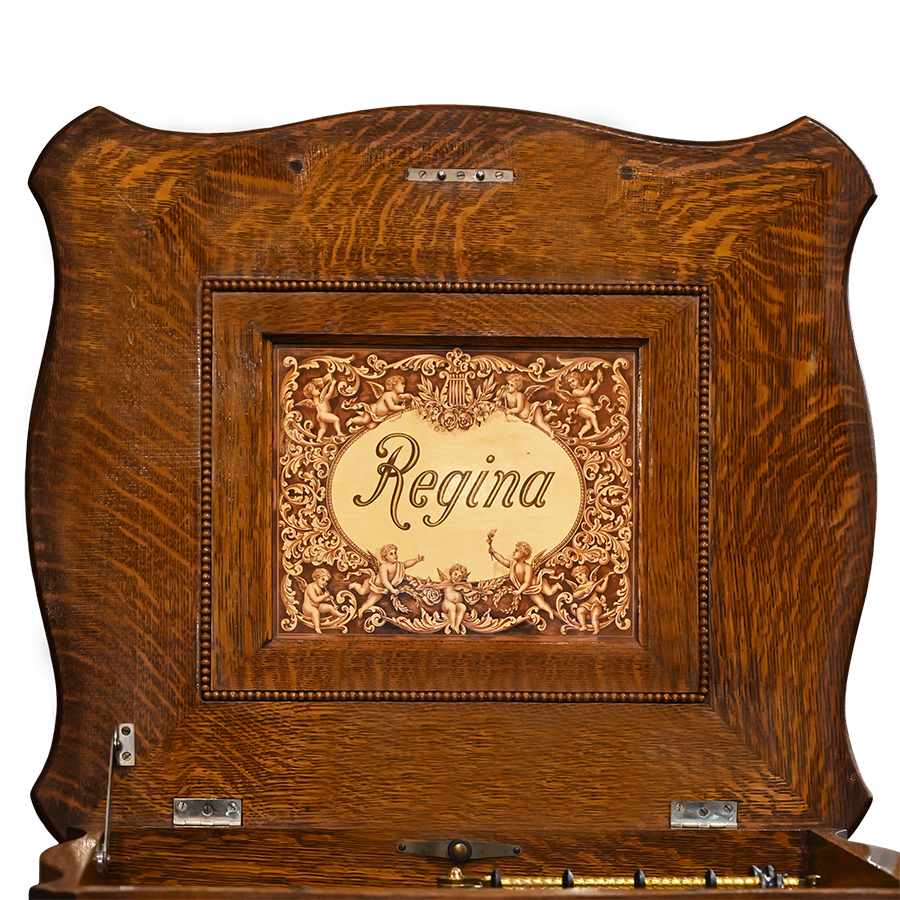 Housed in a beautifully figured serpentine case of quarter-sawn oak, the cabinet immediately draws the eye with its lively grain and warm, original finish. Opening the lid reveals an equally compelling interior, centered by the original Regina lithograph, a classically inspired design adorned with cherubs and scrolling ornament surrounding the iconic “Regina” name, all framed within a carved beaded border that echoes the craftsmanship of the exterior.