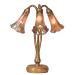 A beautiful 3-light lily lamp crafted by the talented designers at the infamous Tiffany Studios established by Louis Comfort Tiffany. Dating to the tail end of the fabulous Art Nouveau era, the lamp is signed and numbered on the base underside. The gilt bronze ribbed base rises and separates into three stems that are gathered and drape gracefully into lights fitted with lustrous lily form glass shades.  The arrangement of the 3 lights mainly to one side allows for placement and use in a variety of locations. Whether illuminated or not, this splendid lamp is a wonderful decorative and collectors treasure.