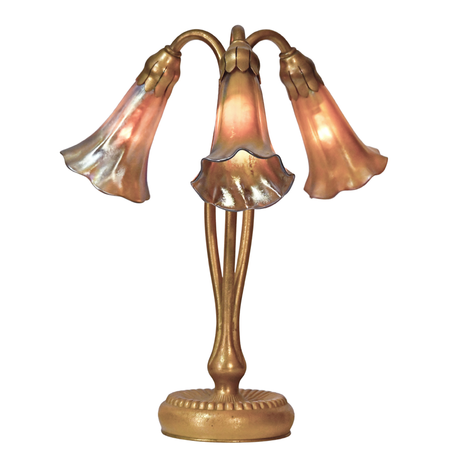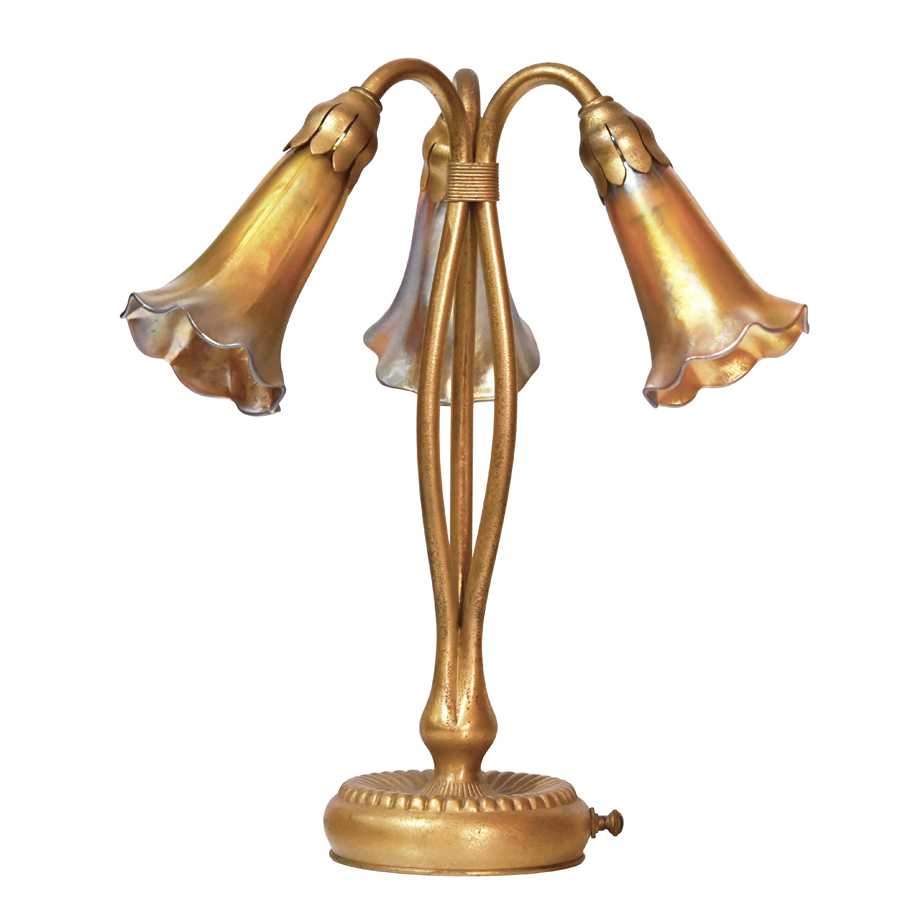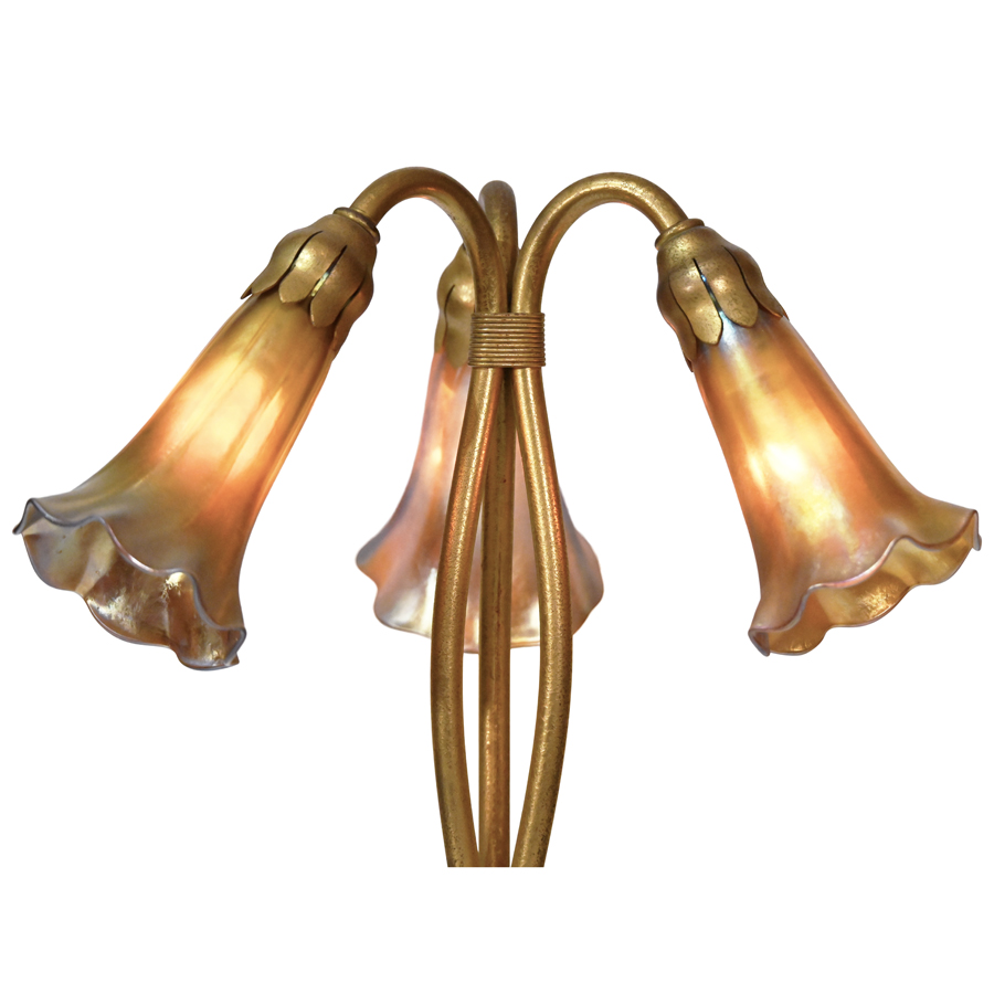 A beautiful 3-light lily lamp crafted by the talented designers at the infamous Tiffany Studios established by Louis Comfort Tiffany. Dating to the tail end of the fabulous Art Nouveau era, the lamp is signed and numbered on the base underside. The gilt bronze ribbed base rises and separates into three stems that are gathered and drape gracefully into lights fitted with lustrous lily form glass shades.  The arrangement of the 3 lights mainly to one side allows for placement and use in a variety of locations. Whether illuminated or not, this splendid lamp is a wonderful decorative and collectors treasure.