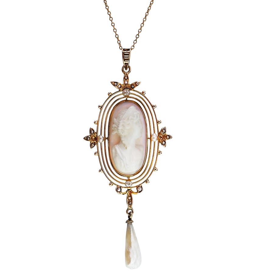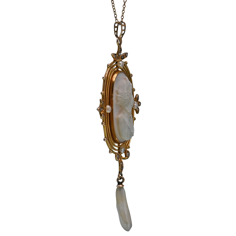 Art Nouveau Shell Cameo & Pearl Pendant Necklace by Bastian Bros