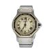 The watch features a cream dial, Roman numerals, calendar display, and sweep seconds hand. Crafted of stainless steel and yellow gold vermeil, the exposed screws exudes the modern innovative design the Santos model is famous for. The notable blue gemstone winding crown completes the look. A fully restored quartz movement powers the timepiece.
