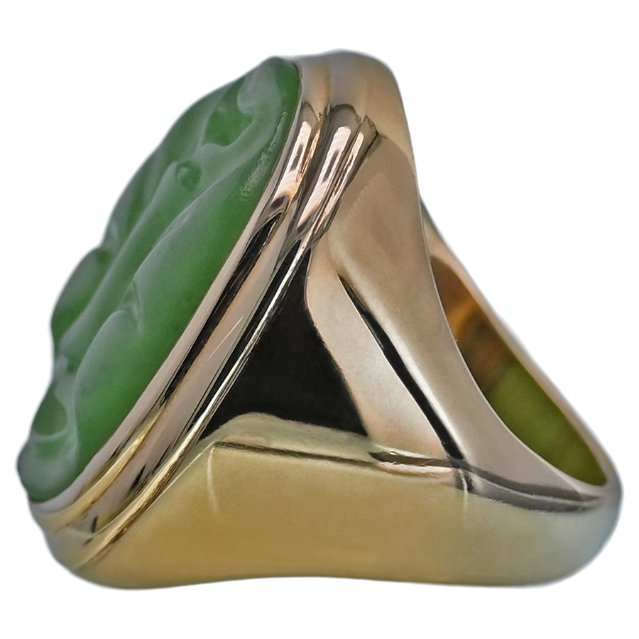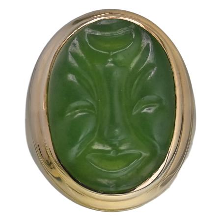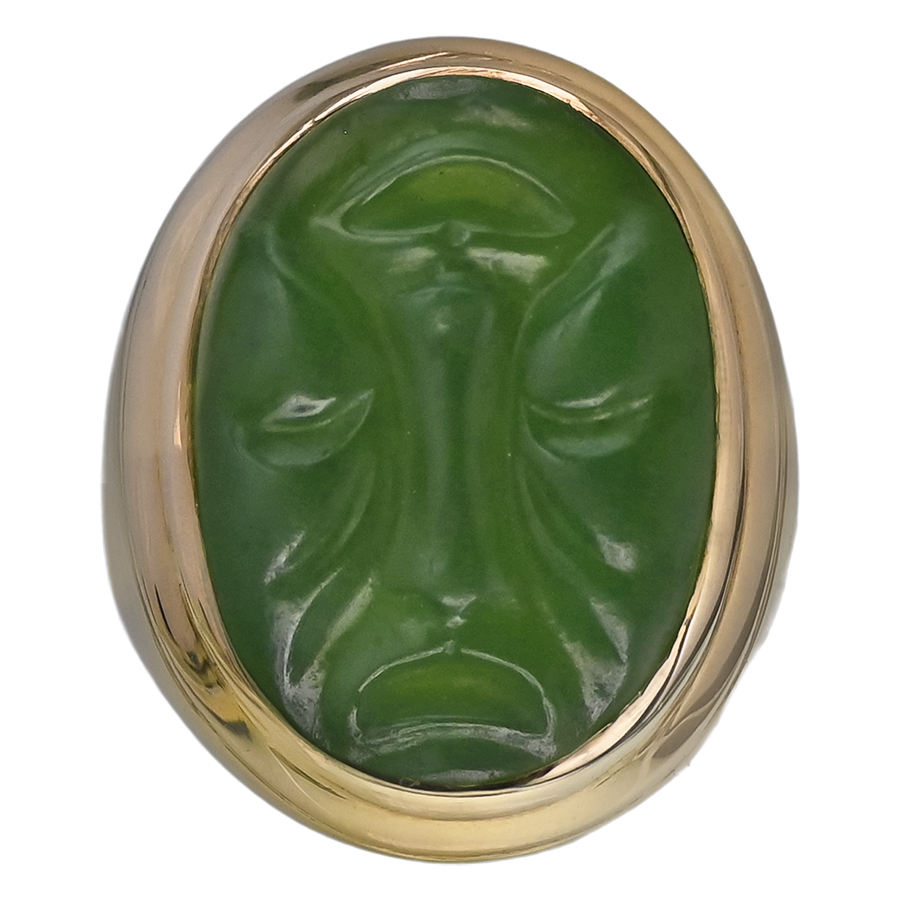 This unique nephrite jade ring features a cleverly carved motif inspired by the comedy-tragedy masks of drama and human nature. A turn of the ring changes the perspective from one to the other. The beautiful, deep green stone, 23.72mm x 17.23mm, resides within a sleekly formed setting of warm 14K yellow gold that hugs the finger nicely.