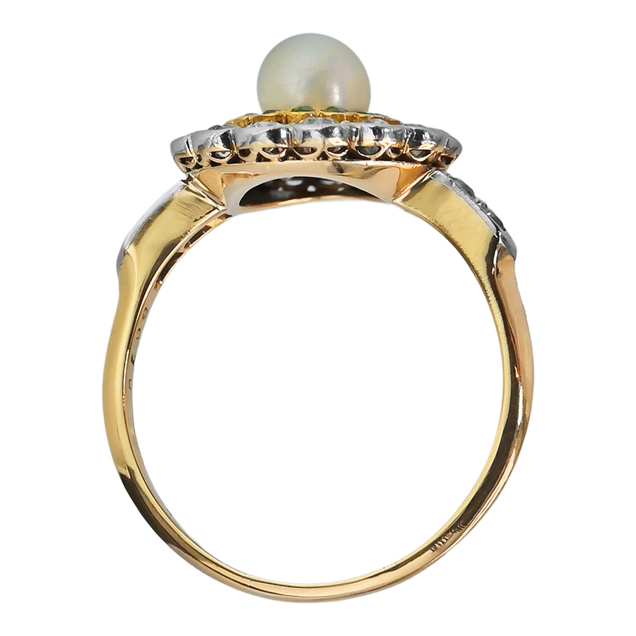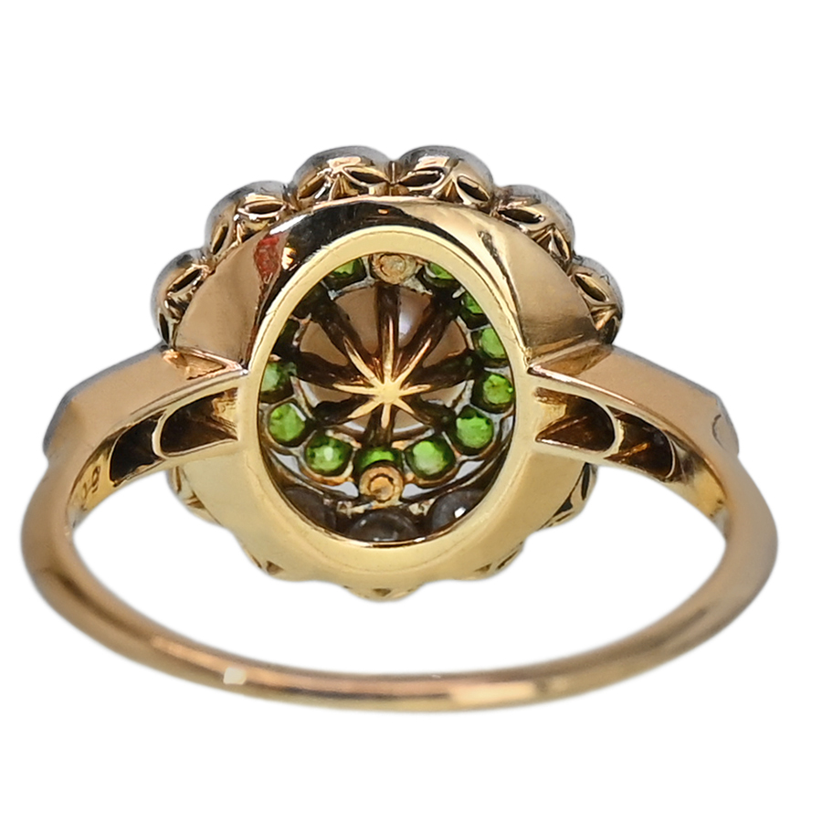 At its center is a softly glowing 5.4mm natural pearl. The pearl is framed by a vivid inner halo of green garnets, their fresh color providing a striking contrast and adding a distinctly period-correct touch. Surrounding them is a scalloped outer halo of old European cut diamonds totaling approximately 0.75 carats. Hand-cut and full of character, these antique diamonds sparkle with a warm, lively brilliance that modern stones simply cannot replicate.