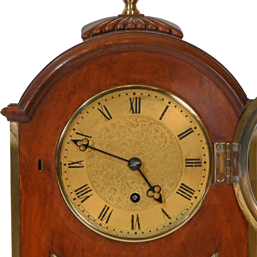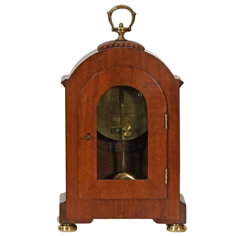This elegant English bracket clock was produced in the mid 1860s by John Carter’s clock company of London. A beautiful example crafted with mahogany and burl walnut accent. The case takes on smaller proportions than most bracket clocks, and is a lovely blend of Regency and Victorian styling. Having a broken arch top over a case with canted brass columns, a hinged circular glass dial door, embellishment of inlaid burl walnut framed by brass inlay, and a molded base raised on brass pad feet.