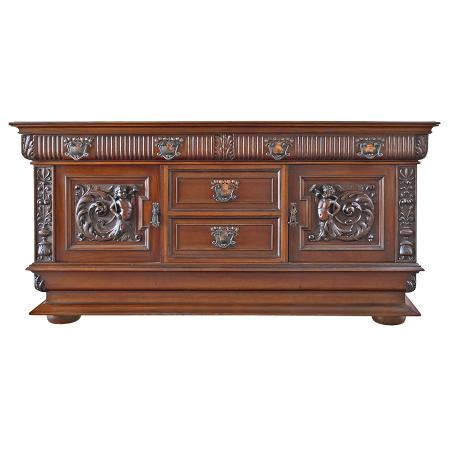 This distinctive antique European buffet is superbly crafted in walnut and has aged to a lovely rich patina. The top is situated over a deeply fluted apron fitted with two long drawers and accented with acanthus leaf embellishments. The case is fitted with two stacked center drawers flanked by exquisitely hand-carved cabinets. Each cabinet showcases wonderful deep relief carvings depicting trumpet-blowing putti integrating with long scrolling foliates. One of the cabinets is fitted with a felt-lined flatware drawer above a metal-lined pull-out for chilling bottles. The outermost edges of each door are also beautifully carved with a decorative accent panel of a potted plant in a raised gadrooned urn. All of the drawer and cabinet pulls are artfully designed in cast brass with a rubbed finish. The base is raised on large bun feet.