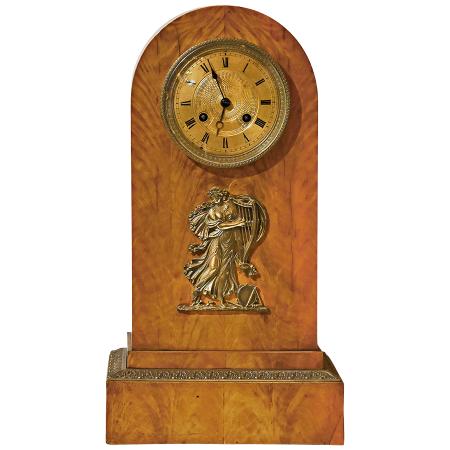This splendid mantel clock dates to 1840 and is beautifully presented in a case of distinctive bird’s-eye maple veneer. Crafted with sleek and elegant Biedermeier characteristics and with a nod to classicism in the lovely bronze ormolu depiction of Terpsichore, Muse of Dance. The plinth base is accented with bronze ormolu trim on all sides.