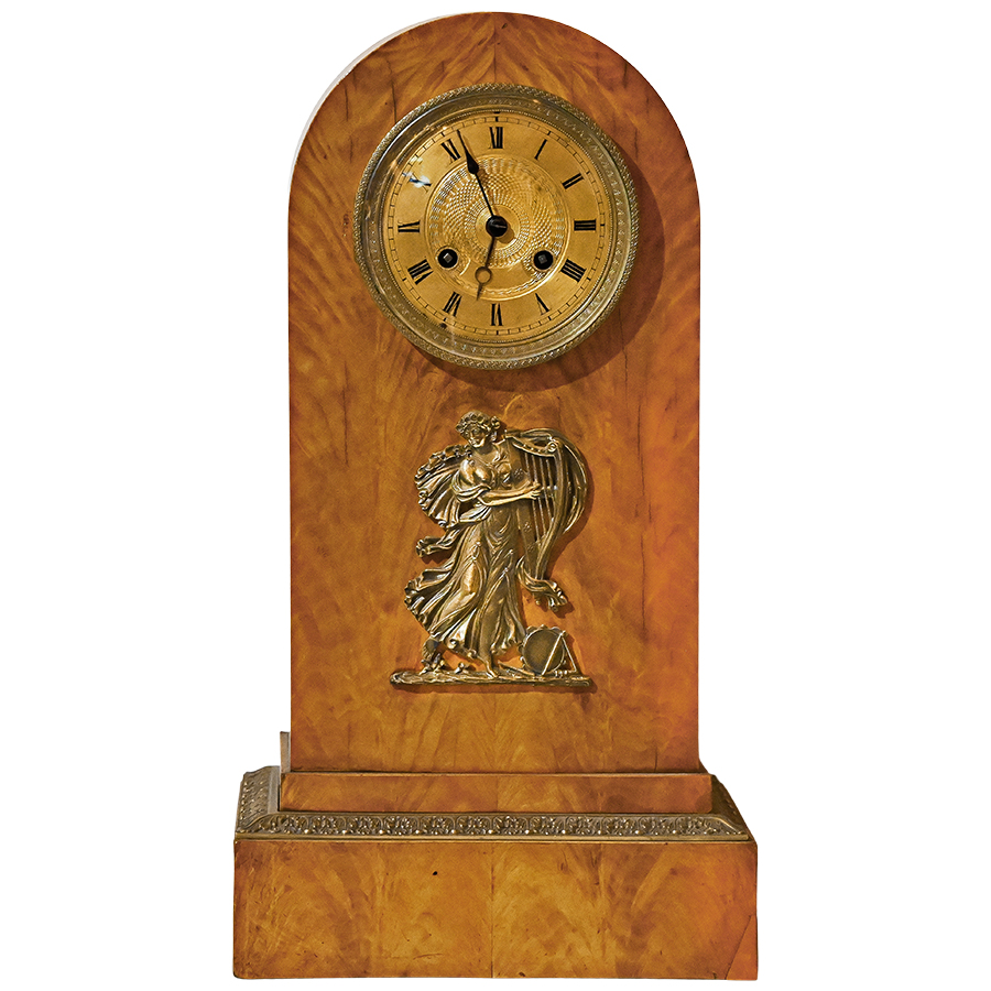 This splendid mantel clock dates to 1840 and is beautifully presented in a case of distinctive bird’s-eye maple veneer. Crafted with sleek and elegant Biedermeier characteristics and with a nod to classicism in the lovely bronze ormolu depiction of Terpsichore, Muse of Dance. The plinth base is accented with bronze ormolu trim on all sides.