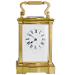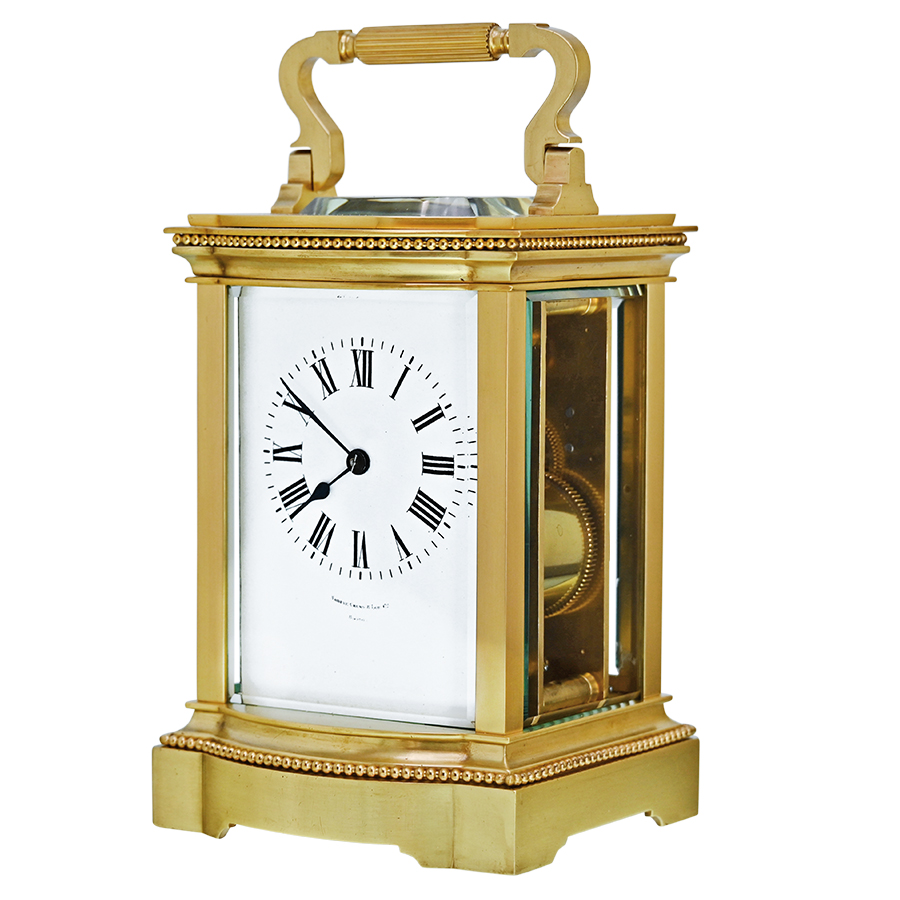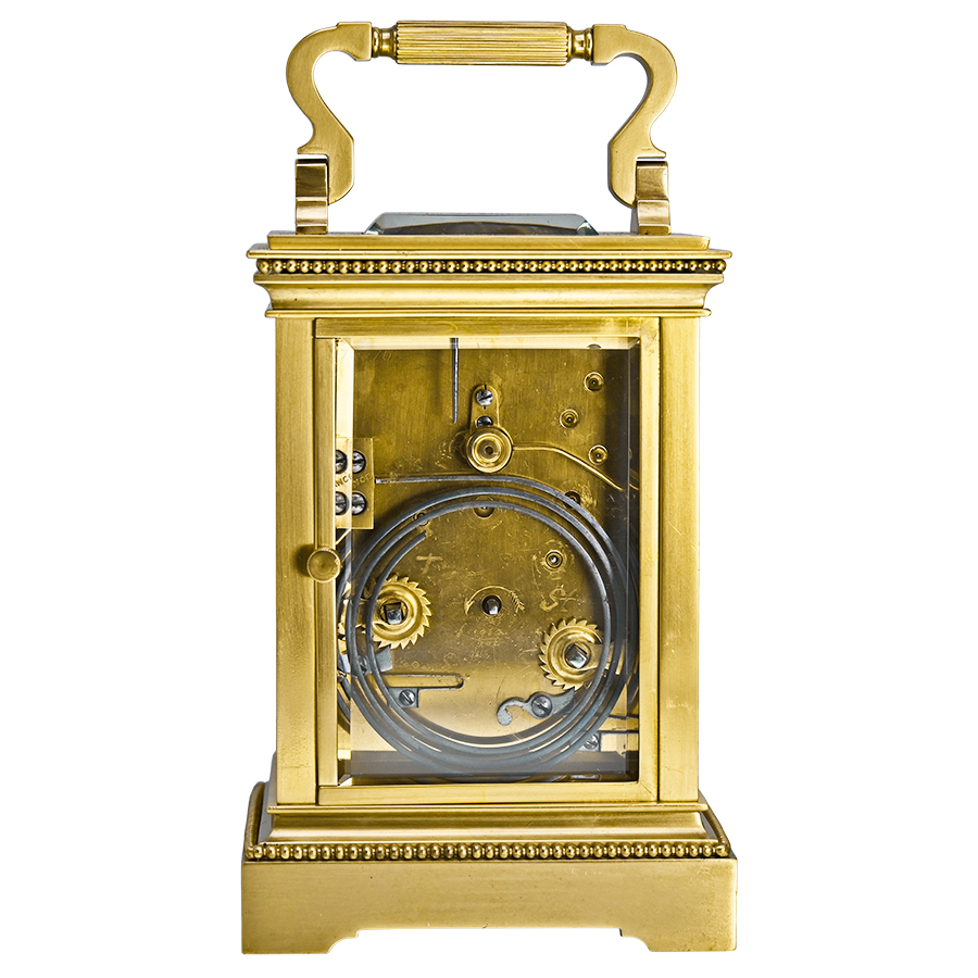 Elegant in proportion and beautifully detailed, this French bow-front carriage clock exemplifies the refined craftsmanship of the late 19th century. The richly toned gilt-brass case features graceful, curved glass panels framed by delicate beaded trim, creating a luminous presentation from every angle. All beveled glass panels allow a full view of the movement within.