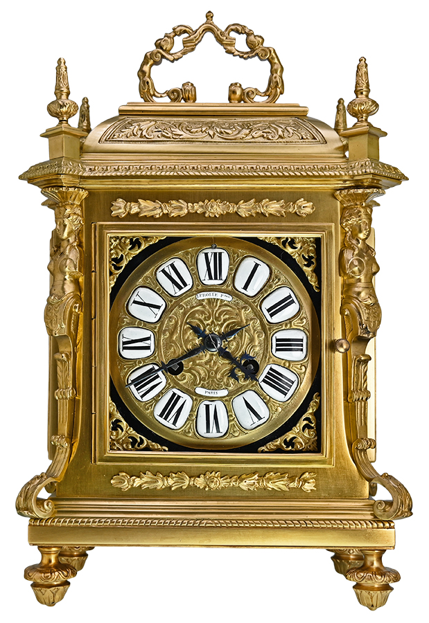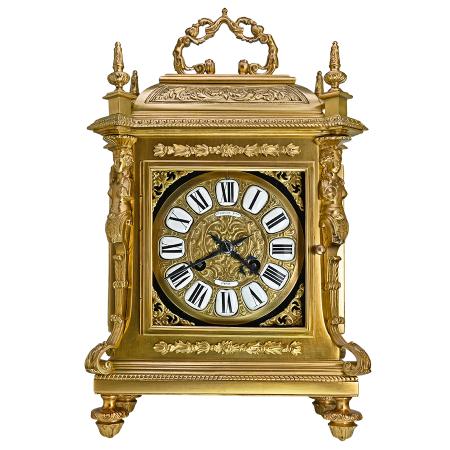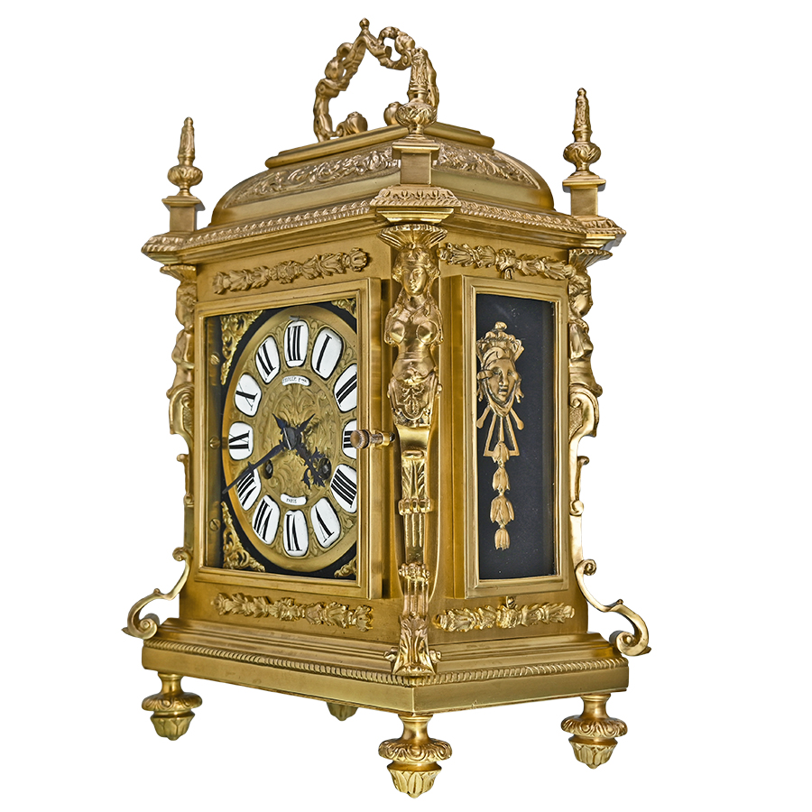 This handsome French mantel clock exudes the refinement of high-quality French horology. The ornate cast brass case features 4 canted corners appointed with sculptural caryatid females. The side panels are ornamented with applied sculptural crowned masks and descending bell flowers on a black velvet ground. Overall the case is richly embellished with expertly chased foliates and trims along with ormolu foliates, spire-top finials, and foliate toupie feet. The carry handle atop is also artfully formed of caryatid female figures.