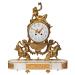 The clock rests upon luminous Carrara marble, its smooth white surface contrasted by intricate gilt-bronze mounts. At its center, a classical relief panel depicts a Roman procession, binding the clock’s narrative firmly to the iconography of antiquity. The hand-painted convex porcelain dial features delicate floral garlands, Arabic numerals, an indistinct signature, and ornate gilt brass hands. Within, an 8-day movement strikes the bell on the hour and half-hour.