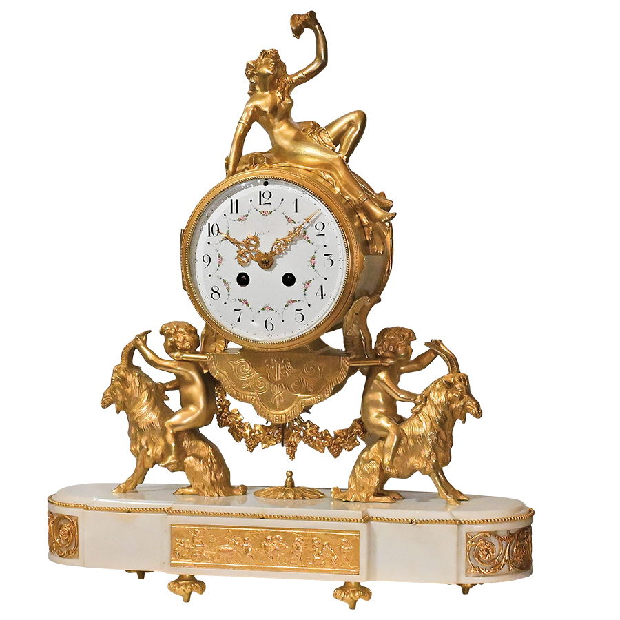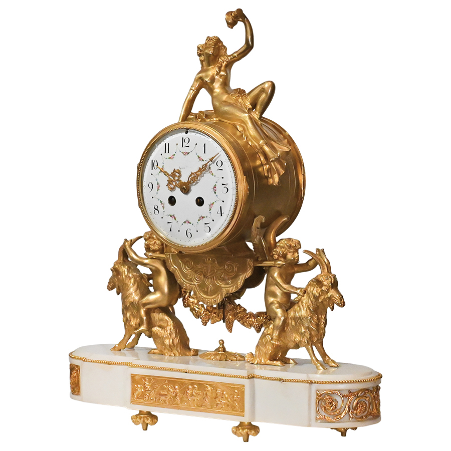 Two charming winged cupids support the clock, each riding a finely modeled goat, figures associated with rustic festival imagery and abandon of ancient Dionysian myth. Their forms are rendered with remarkable detail, from the texture of their fur to the fluidity of the cupids’ poses.
