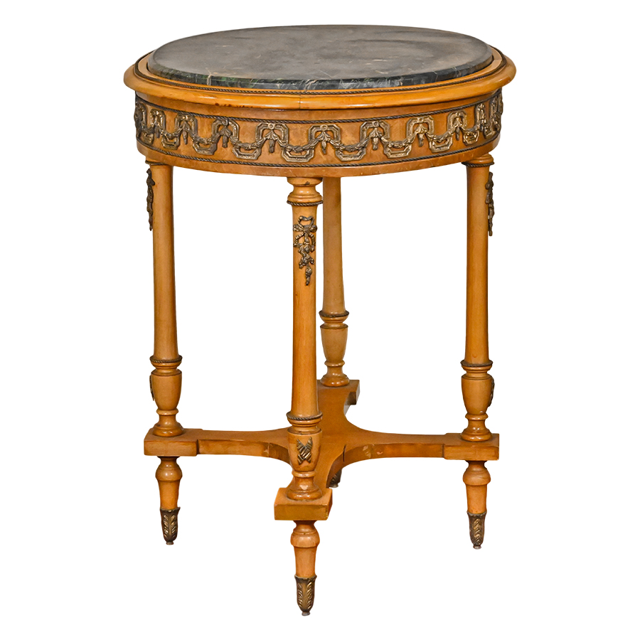 This beautiful turn-of-the-century table is crafted in fruitwood with sleek elegant lines. Having an oval shape on four turned legs with vasiform pedestals joined by a broad stretcher. The wood has achieved a warm patina and is nicely contrasted by a green-black Italian marble top. As a Louis XVI style piece it is characteristically adorned with decorative bronze ormolu mounts and has decorative capped feet.