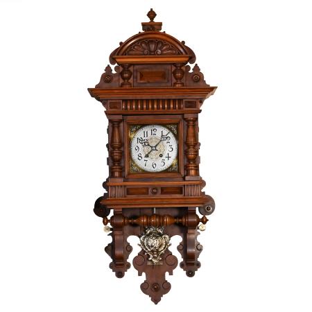 Keeping the time within this impressive clock is an 8-day regulator timepiece equally renowned for quality and accuracy. A pleasing gong strike marks the hour and half-hour. The time displays on a silvered and engraved brass dial with decorative center, Arabic numerals, and traditional German pierced regulator hands. An ornate cast brass pendulum with cherub motif finishes the clock beautifully.