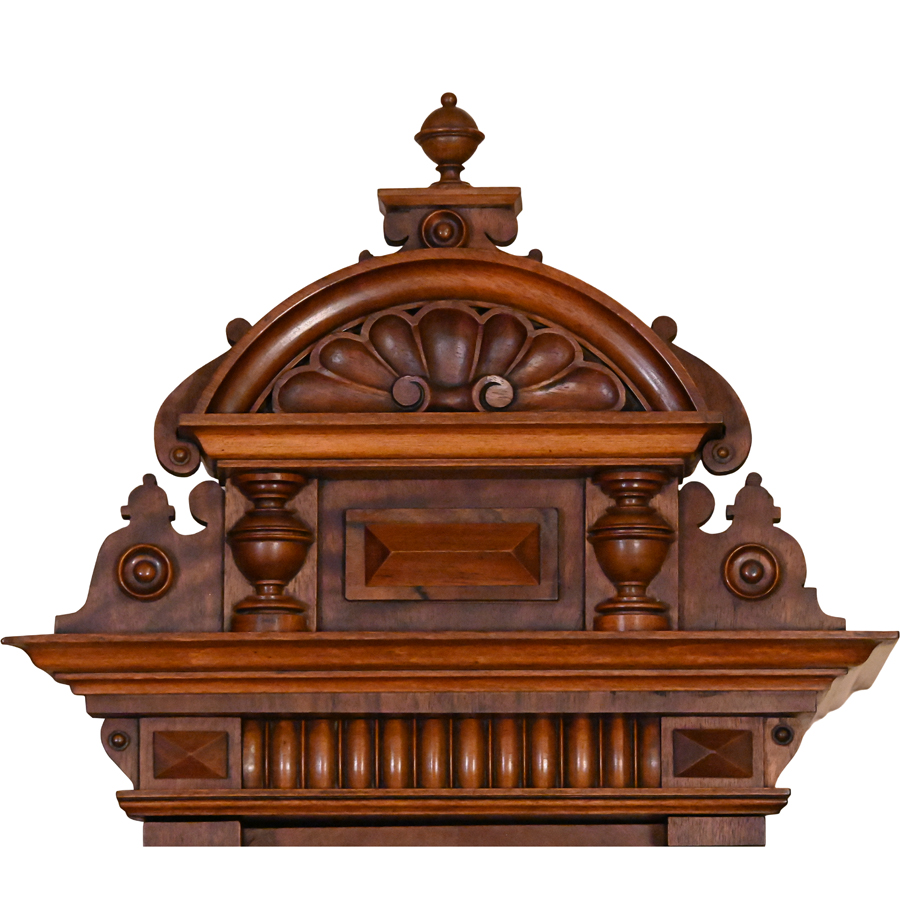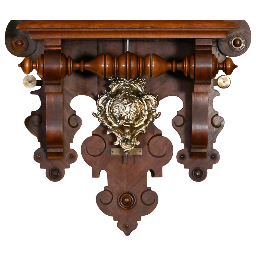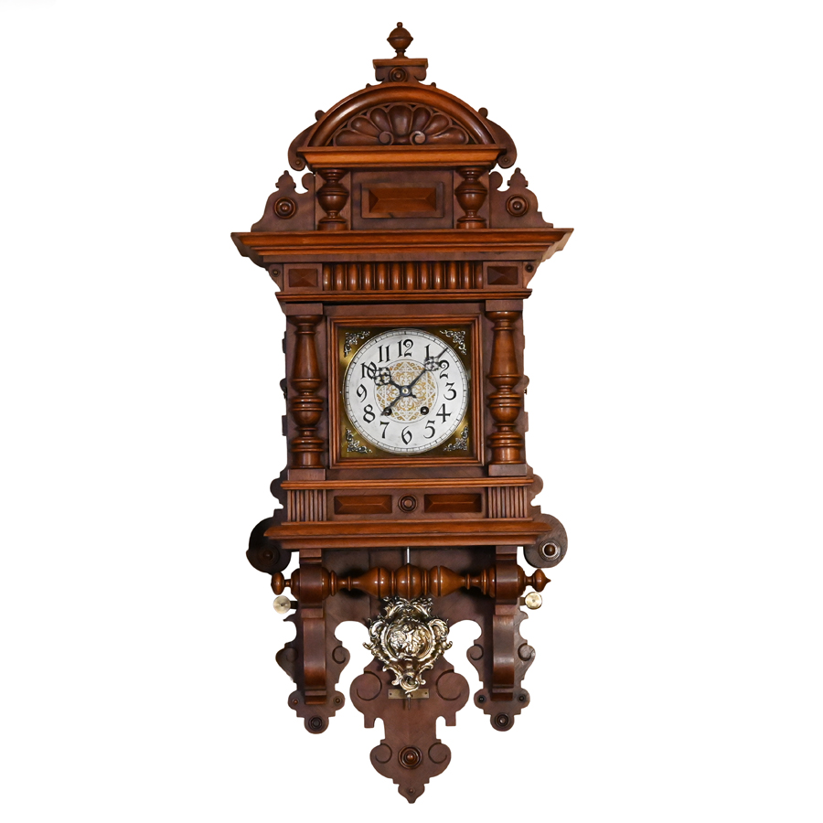 This handsome German wall clock exudes the high-quality craftsmanship and ornamentation Lenzkirch is renowned for. The case of richly patinaed walnut is embellished with myriad expertly executed carvings, moldings, and turnings throughout.