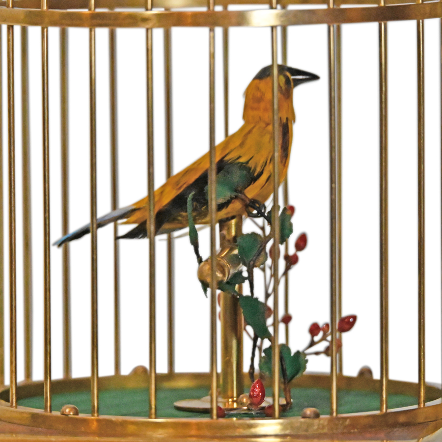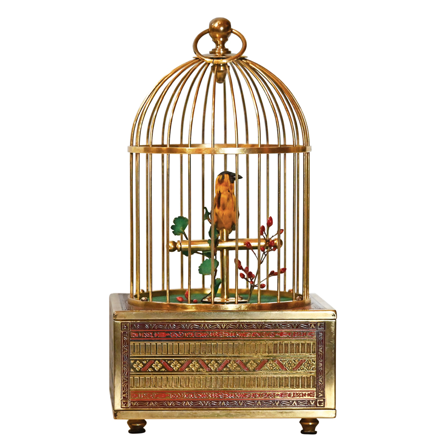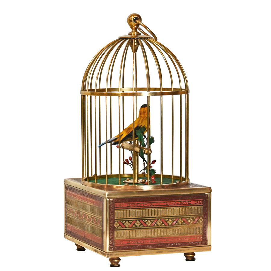This enchanting automaton features a mechanical bird singing a delightful tune. The brass cage is embellished on the footed base in a unique embossed foliate and floral motif accented with polychrome colors of red and burgundy. Singing cheerfully upon its perch, the little yellow bird with green and black feathers also turns its head and flicks its tail. It is manually activated with a lever, while a manual spring-wound mechanism drives the animation and song. This charming German automaton has undergone a full restoration and bears a one-year warranty. Singing birds continue to be one of the most coveted forms of automata.
