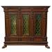 Each of the three doors is fitted with finely wrought iron grillwork laid over peridot-hued pebble glass, creating an elegant interplay of texture, light, and color that gives the cabinet a jewel-like glow. Acanthus corbels crown the top apron, while intricately scrolled and swagged columns provide vertical rhythm and classical refinement along the front.