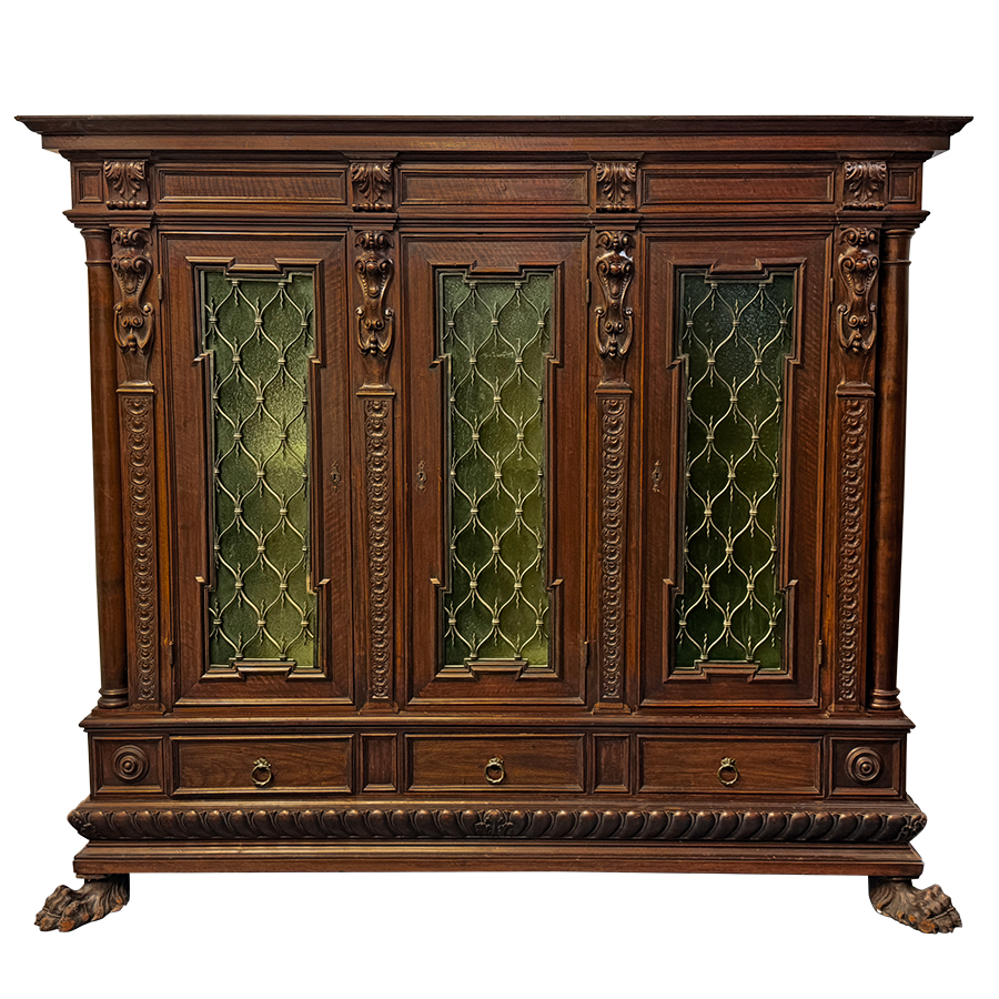Each of the three doors is fitted with finely wrought iron grillwork laid over peridot-hued pebble glass, creating an elegant interplay of texture, light, and color that gives the cabinet a jewel-like glow. Acanthus corbels crown the top apron, while intricately scrolled and swagged columns provide vertical rhythm and classical refinement along the front.
