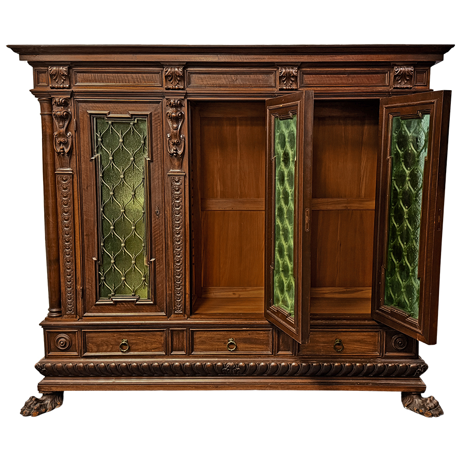 Below, three neatly paneled drawers offer additional storage and are set above a deeply carved gadrooned molding. The entire piece rests proudly on large, dramatic claw feet, giving the cabinet a commanding yet beautifully balanced silhouette.